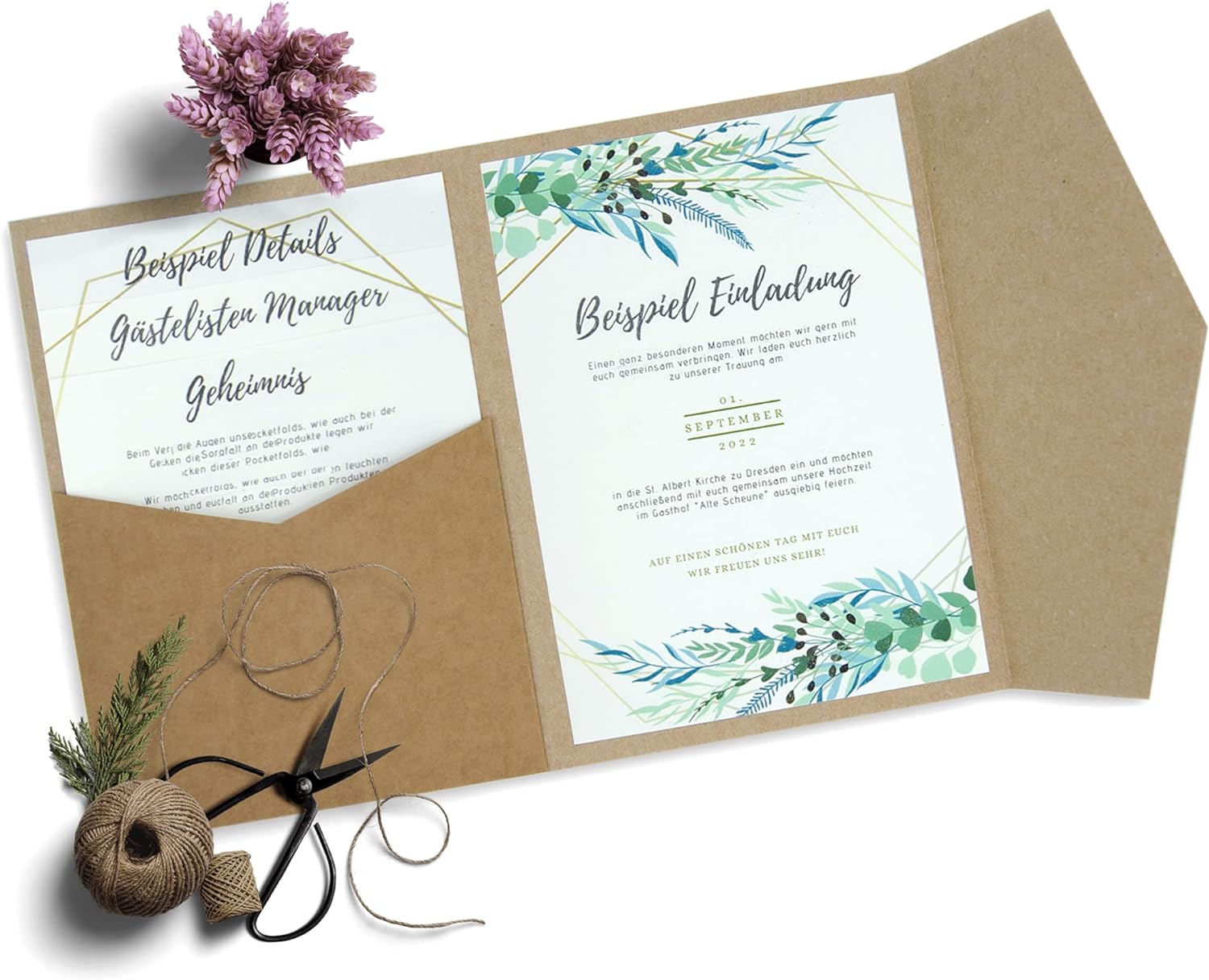 • ✔ EINFACH ZU VERARBEITEN: Deine Pocket Folder Kraftpapier kommen vorgerillt und mit Anleitung zu dir. Mit etwas Klebstoff die Tasche finalisieren und die Pocketfolds Invites frei gestalten. Fertig.