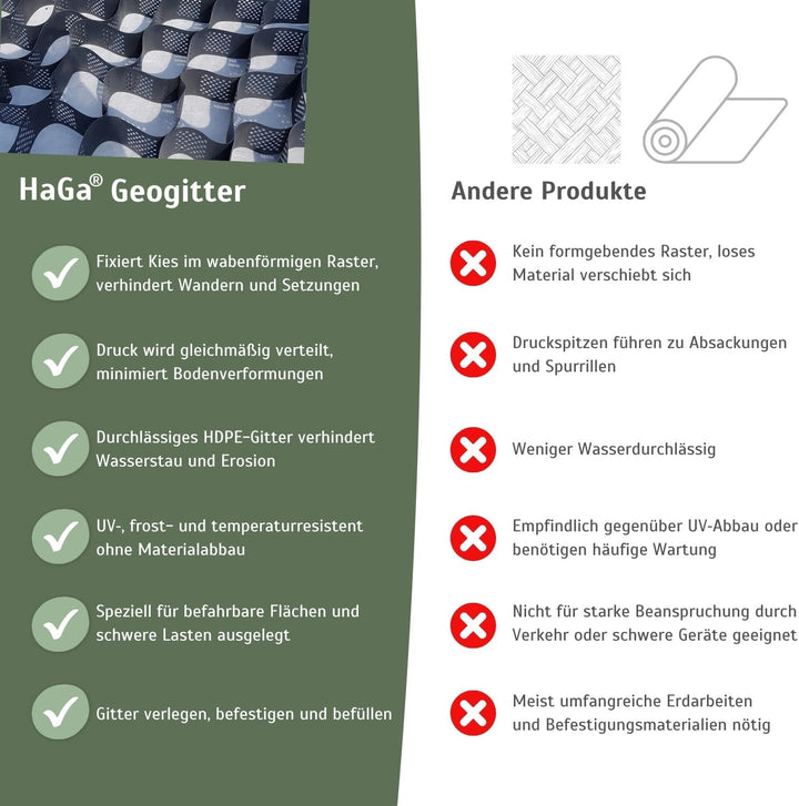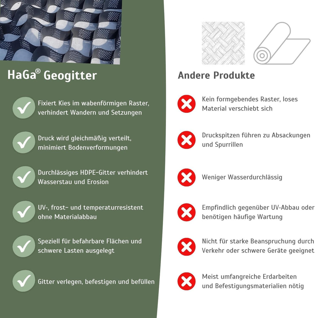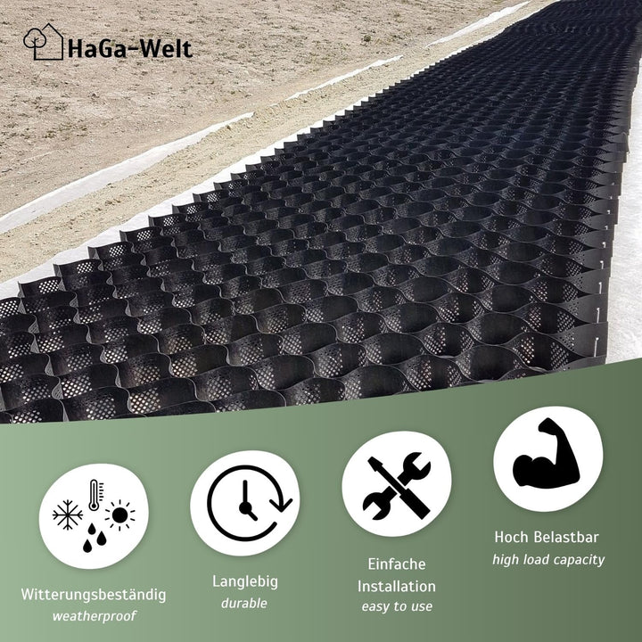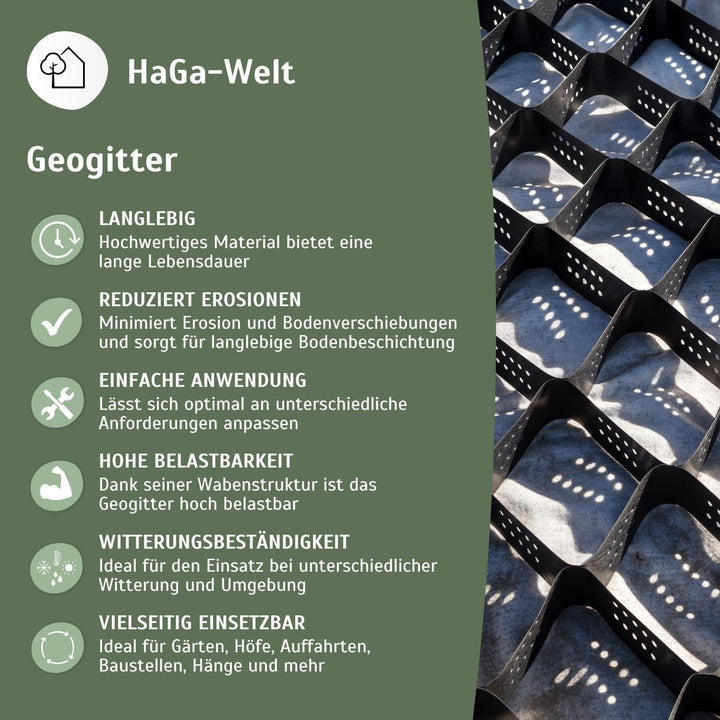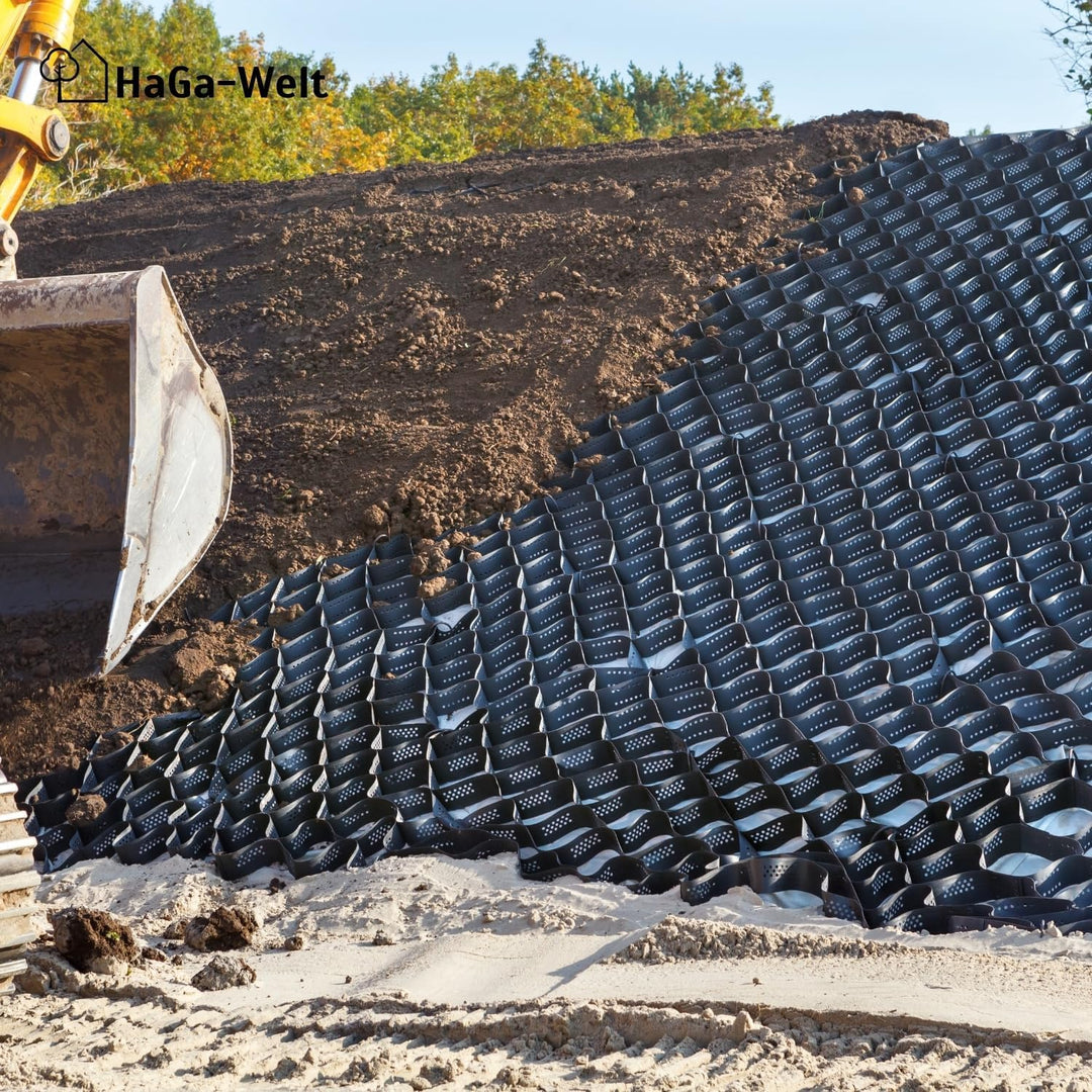 - STABILE BODENFLÄCHE: das Geogitter sorgt für eine stabile Bodenfläche und verhindert das Absacken von Böden.