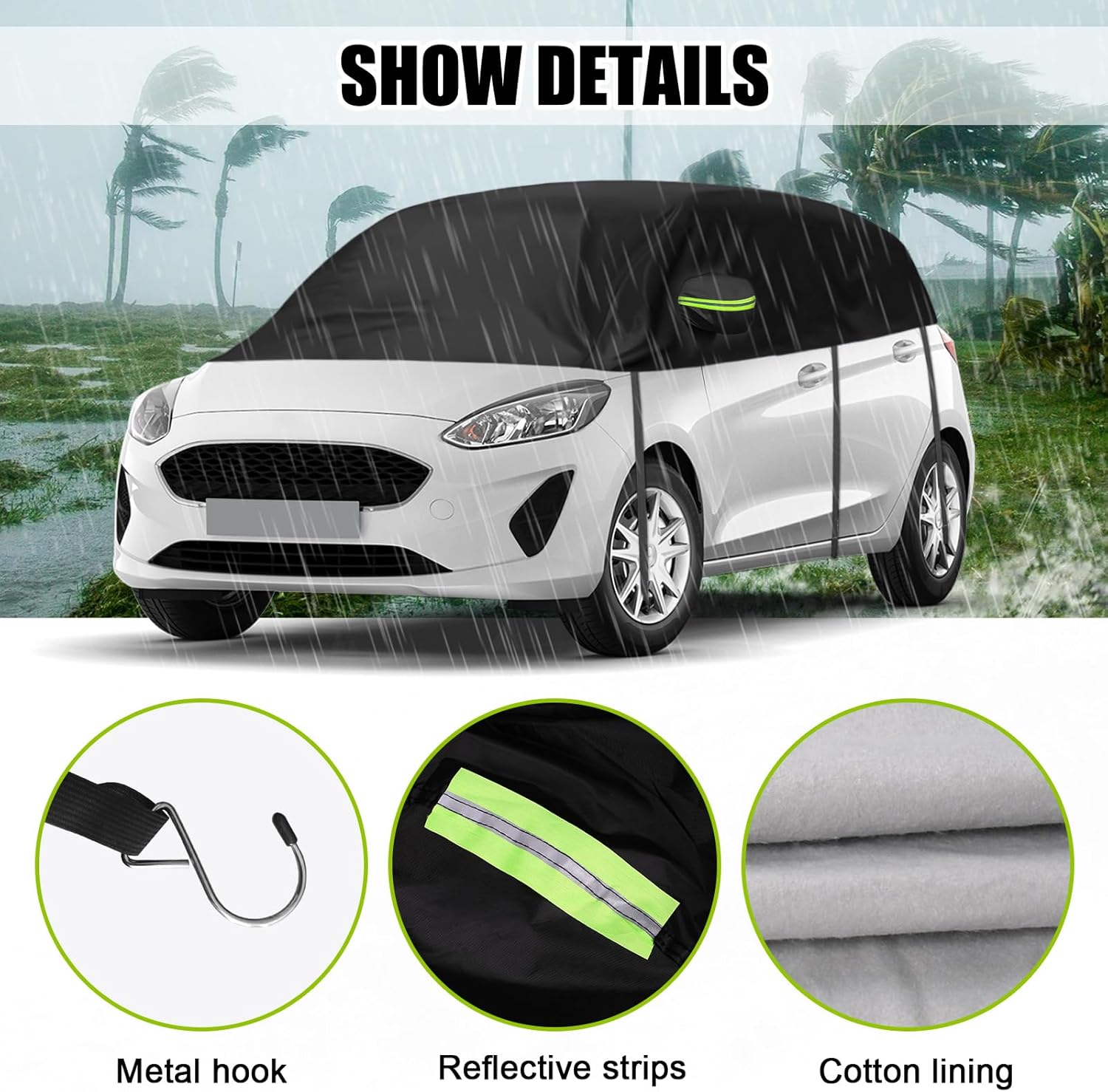 - Massgeschneidertes Spezialauto, perfekt angepasst:Halbe Autoabdeckung Kompatibel mit Ford Fiesta hatchback 2008-2023, Upgrade Verdickter Stoff mit Baumwolle Gefüttert, Allwetter Reflektierende Autoabdeckung Wasserdichte Schutzhülle Schneeschutz