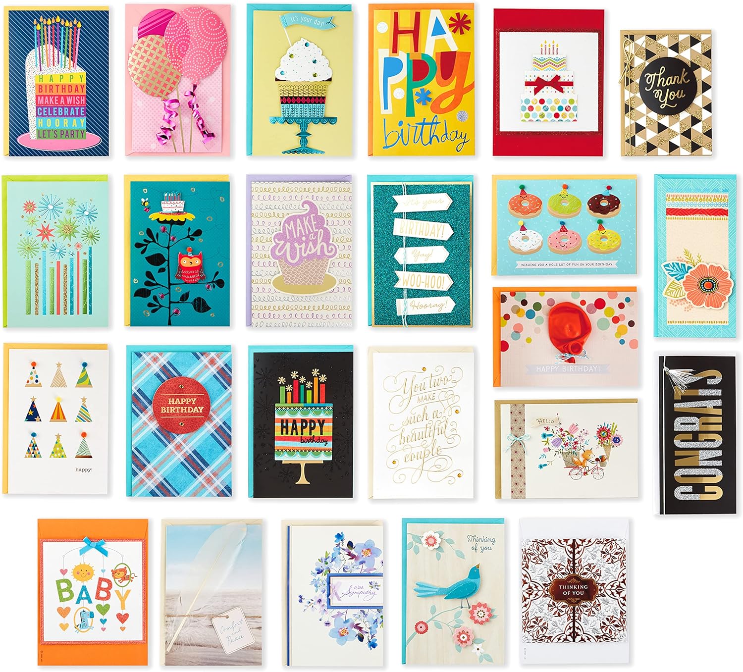 • Dieses Set enthält 14 Geburtstagskarten; 2 leere Karten, „Thinking of you“ und „Mitteilungskarten; und 1 Baby-Karte, Hochzeitskarte, Dankeskarte und Glückwunschkarte. Kartengrösse variiert, zusätzliches Porto kann erforderlich sein.