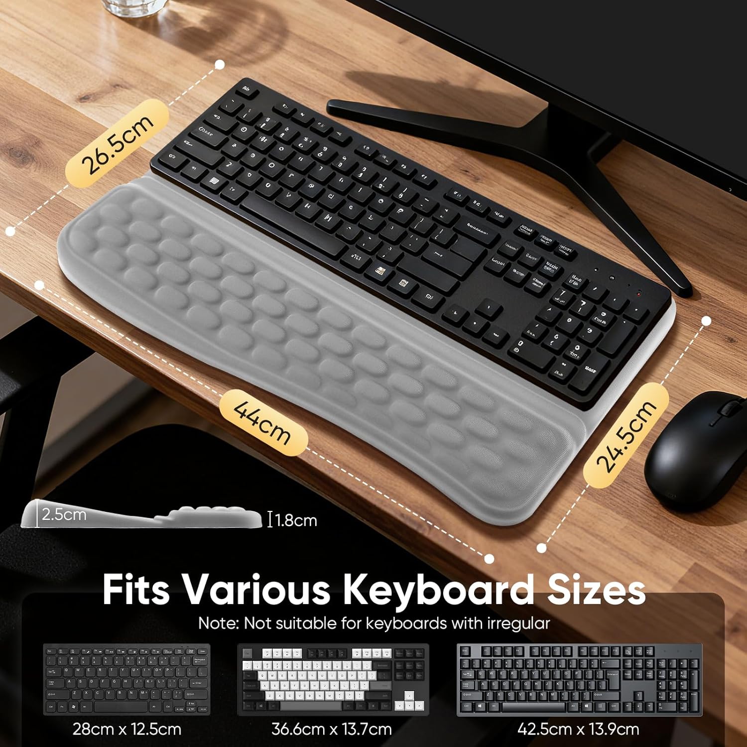 - ☁️【Stabile Handgelenkauflage für alle Tastaturtypen】 Mit den Massen 44 × 24,5 × 1,8 cm ist diese Tastatur Handauflage die ideale Schreibtisch Unterlage für Standard- und Mechanische Tastaturen. Die Handgelenkstütze Tastatur unterstützt eine