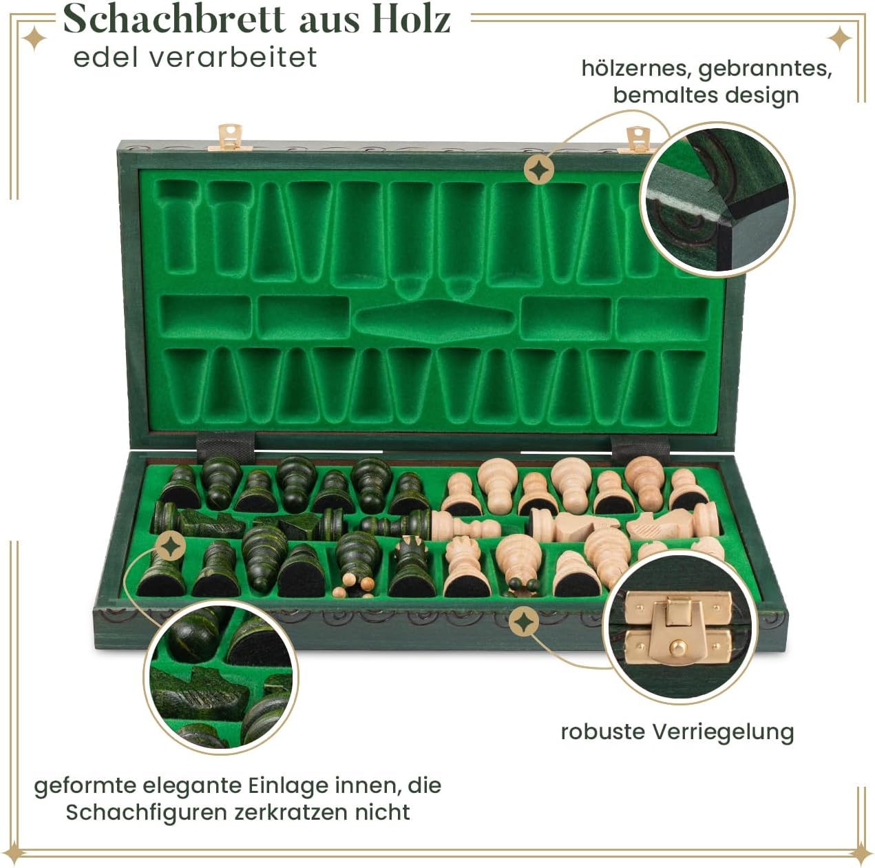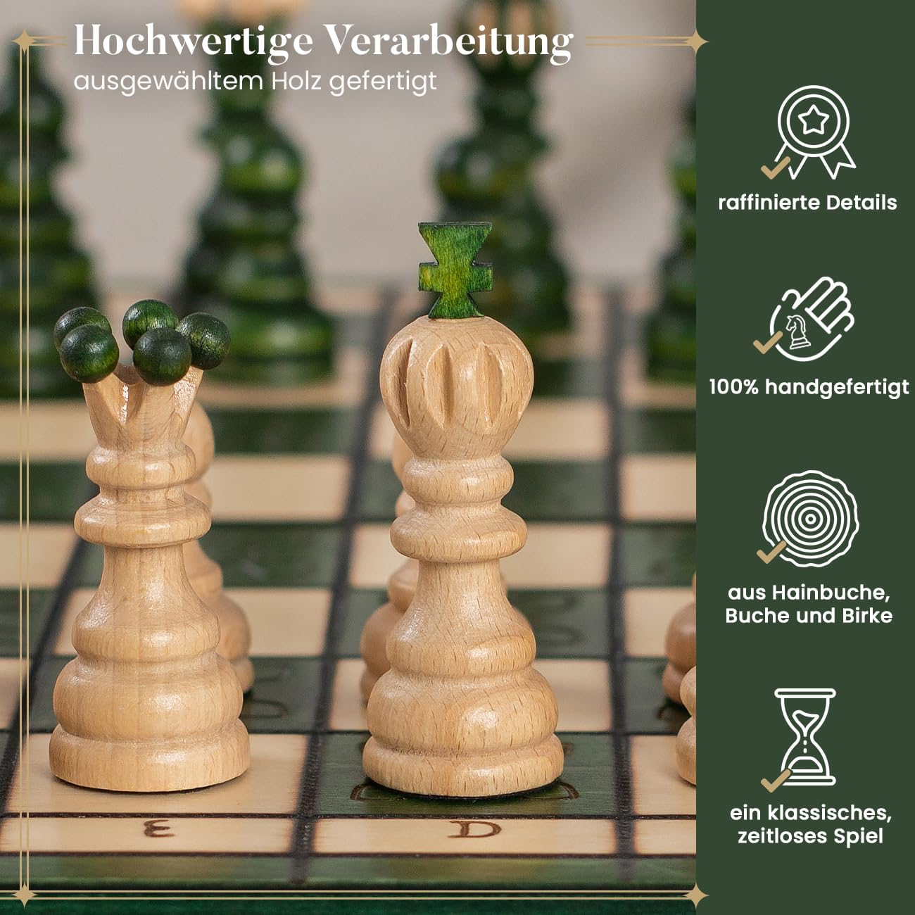- 𝗛𝗮𝗻𝗱𝗴𝗲𝗺𝗮𝗰𝗵𝘁 - Jedes grüne schachbrett gross wird von unseren Handwerkern von Hand bemalt und graviert, so dass das Endprodukt leicht von der Abbildung abweichen kann. Dies stellt sicher, dass Ihr Set individuell