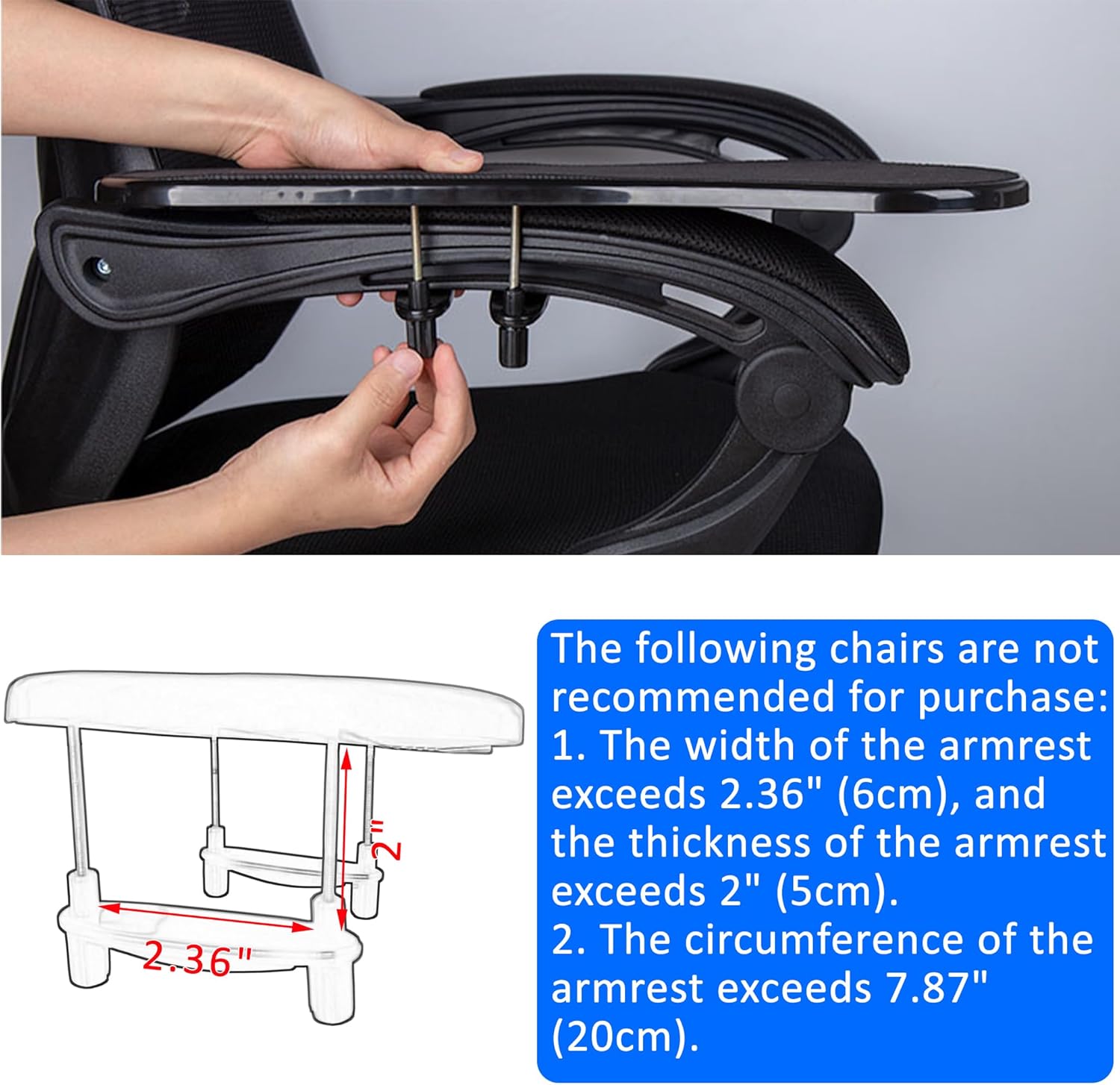 - 👉【STUHL ARMLEHNENSTÜTZE MAUSPAD HALTER】- Die Armstütze ist geeignet für Stuhl Armlehne bis zu 2,36 Zoll (6cm) Breite und bis zu 2 Zoll (5cm) Stärke. Der Umfang der Sesselarmlehne kann 7.87 Zoll (20cm) nicht überschreiten. Bitte messen Sie vor