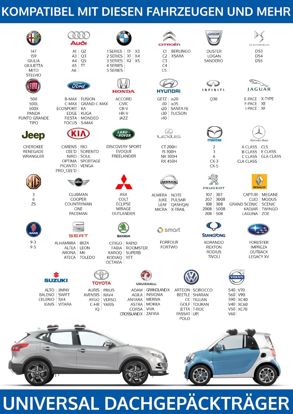 - Die Mehrzweck- und Universalträger passen auf fast alle Autotypen – der Dachgepäckträger kann zwischen Autos ausgetauscht werden (es werden keine seitlichen Schienen oder Dachrinnen benötigt), egal ob es sich um Stadtautos, Autos mit Fliessheck,