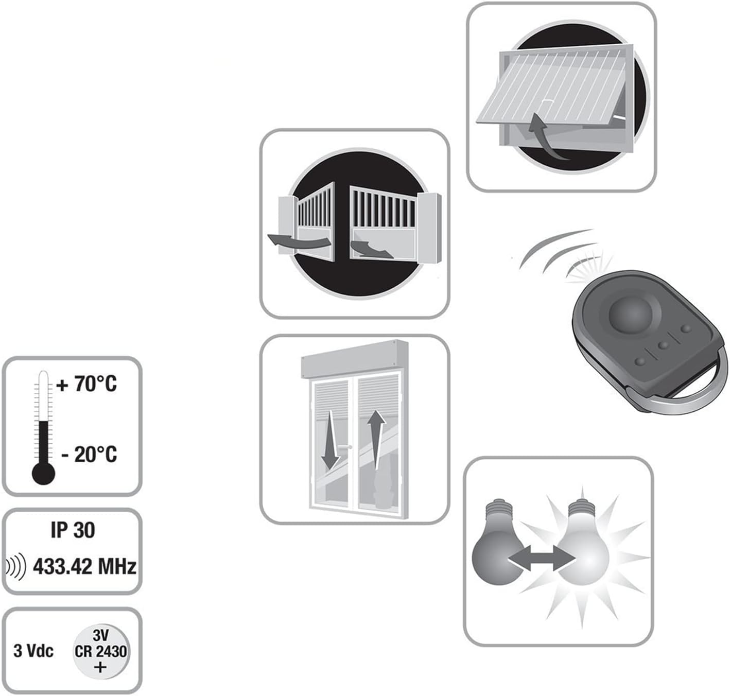 - Programmierart: Registrierung am Empfänger Anwendungen: Garagentor, Rollo, Portal