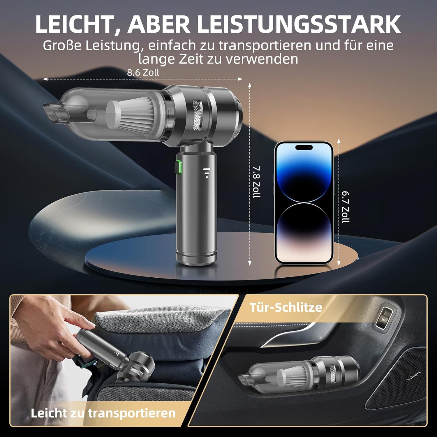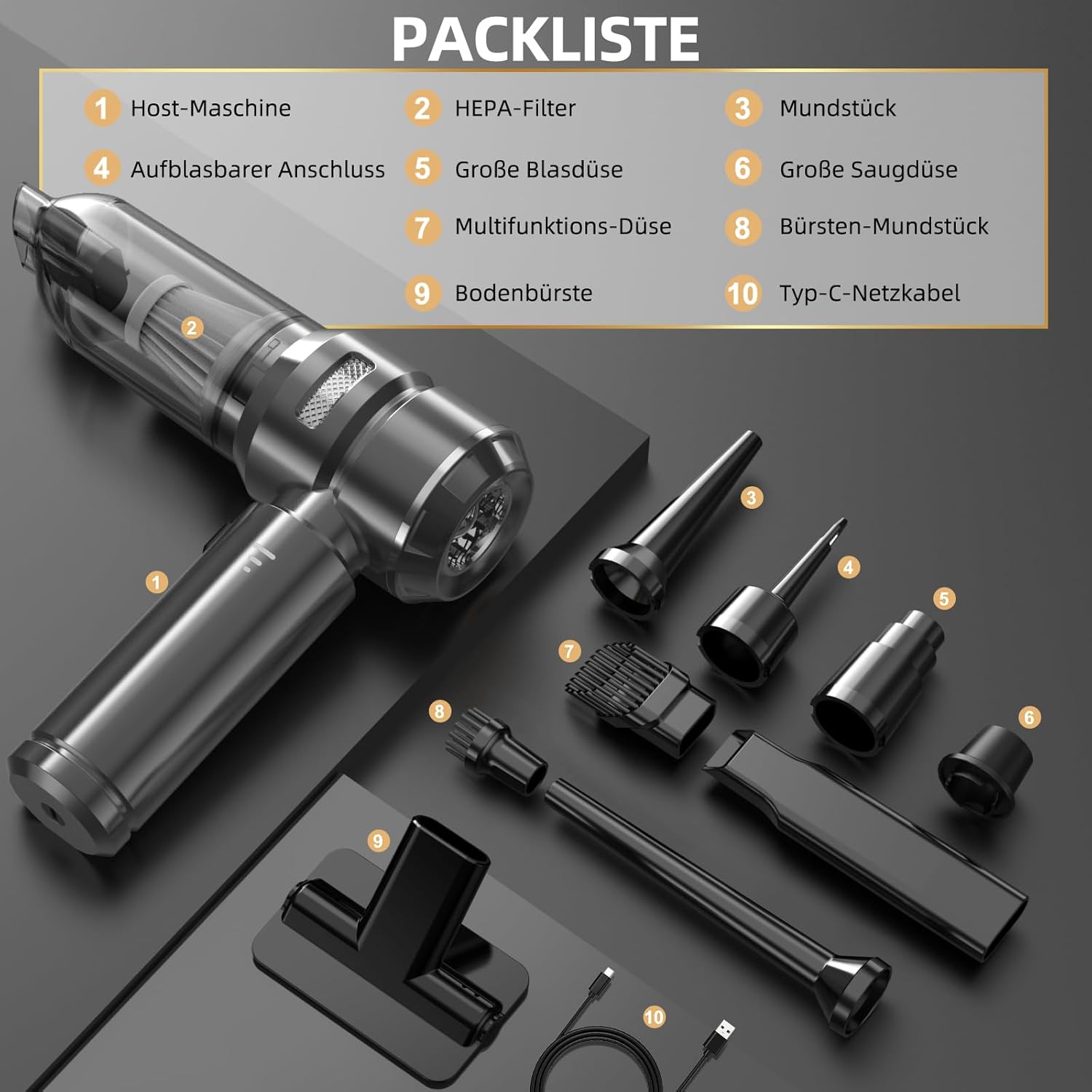 - 【4-IN-1-Autostaubsauger】Dies ist nicht nur ein Akku handstaubsauger kabellos, sondern Ihr Allround-Reinigungsassistent. Durch die Kombination von vier Schlüsselfunktionen (Saugen, Staubblasen, Aufblasen und Vakuumieren) erfüllt er verschiedene