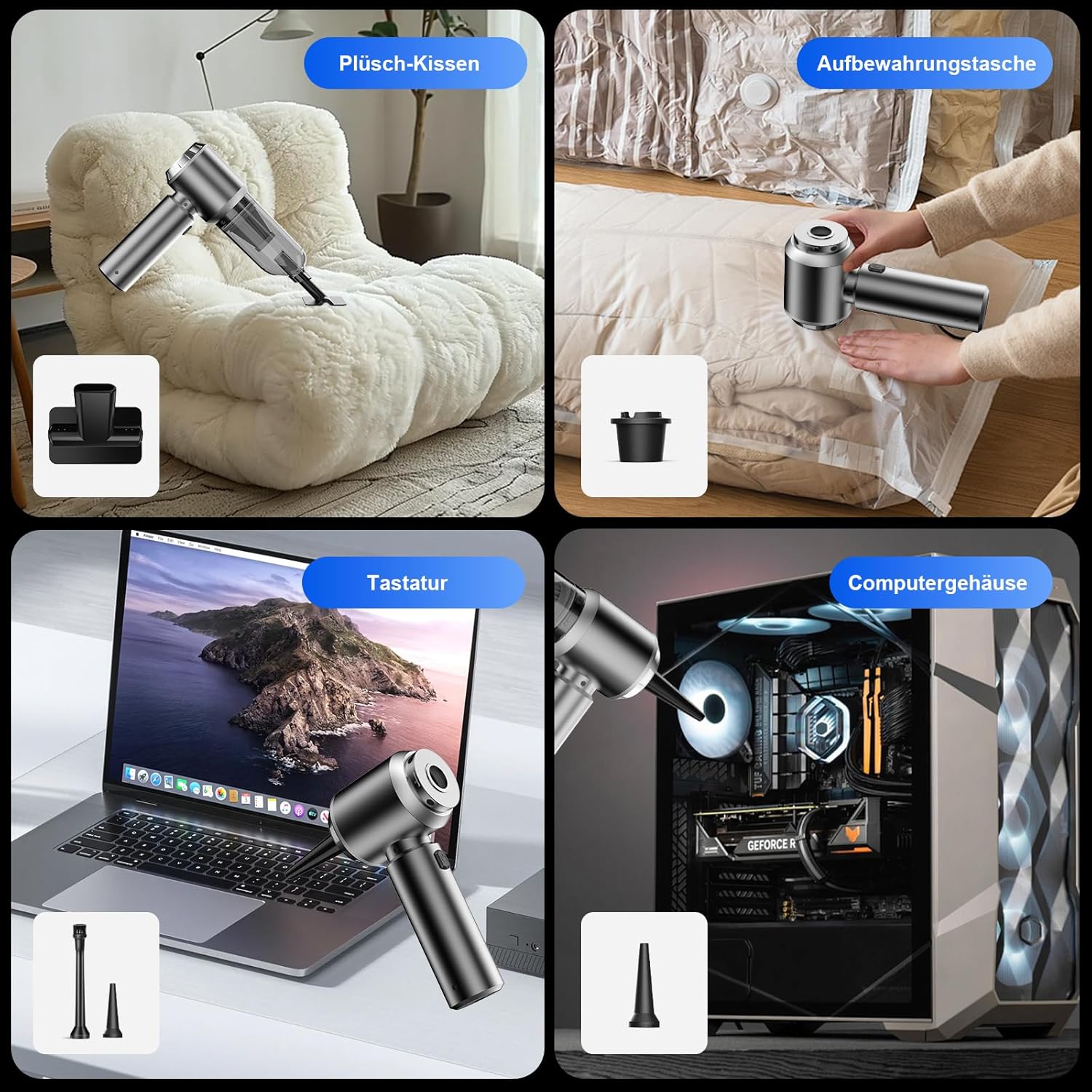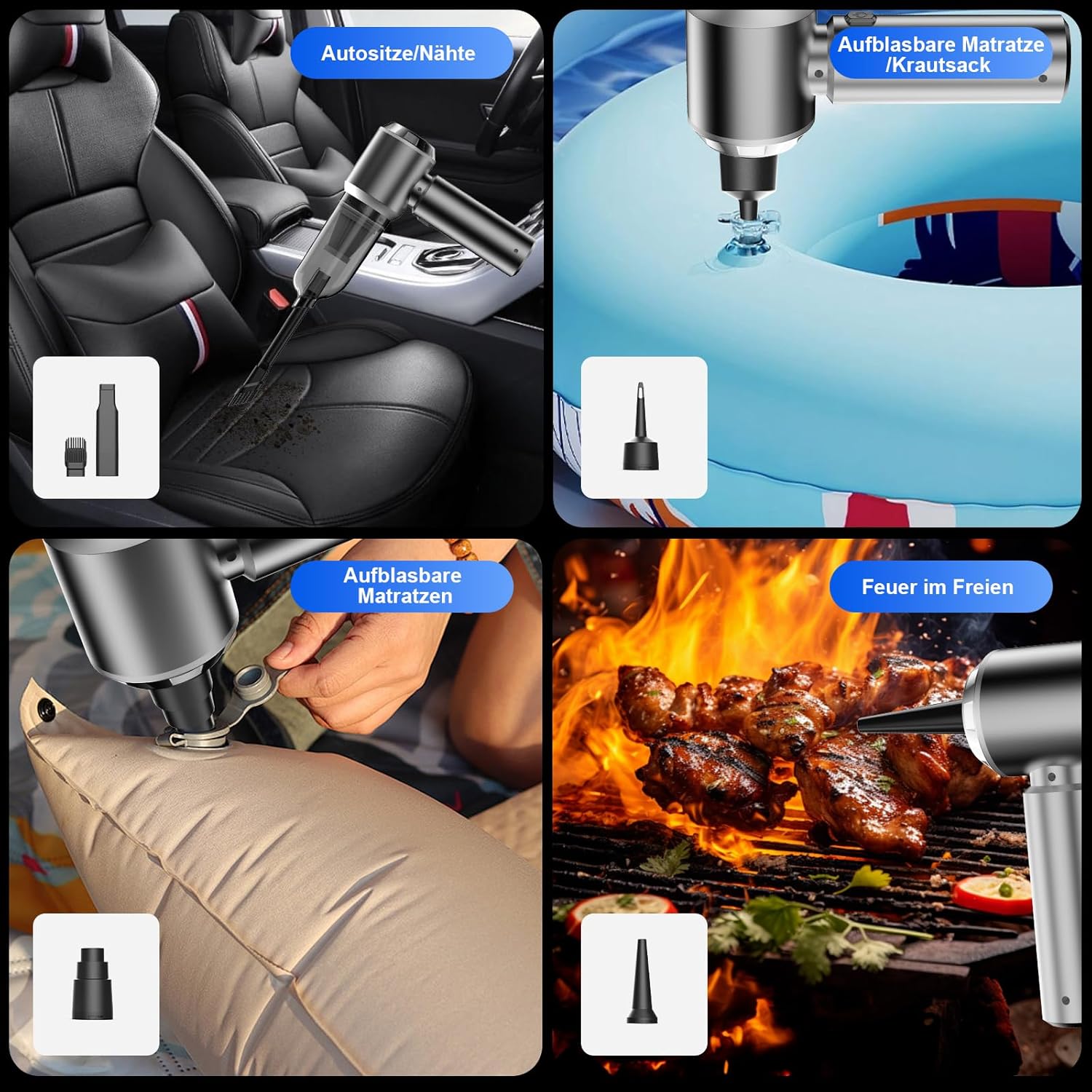 - 【4-in-1-Vielfalt Für vielfältige Anwendungen】: Akku Staubsauger mit 9 Zubehörteilen: Blasen, Saugen, Luftentzug und Aufblasfunktionen. Saugen von Staub, Schmutz und Tierhaaren in Haus, Küche und Auto, Evakuieren von Luft aus Rasensack-Beuteln,