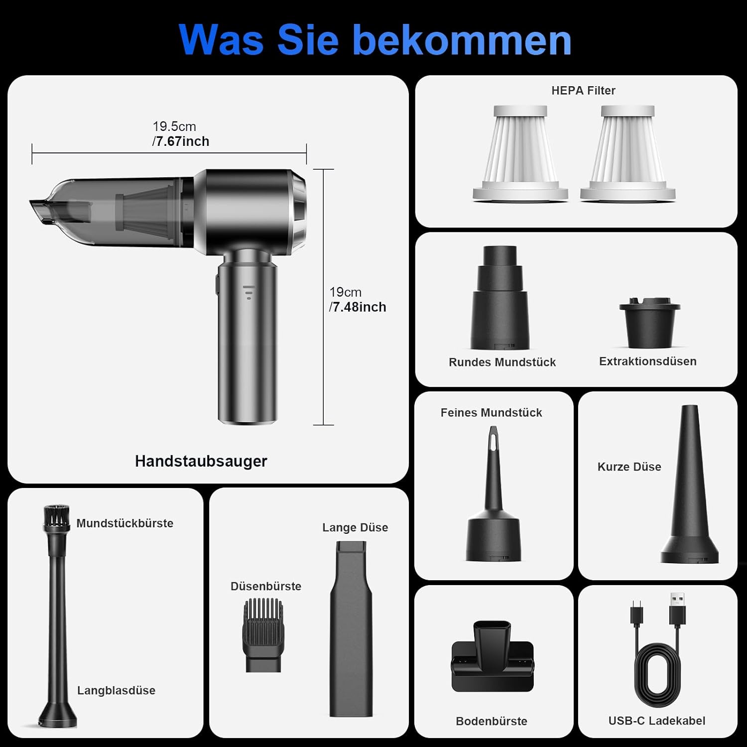 - 【Was Sie bekommen】: 1x Handstaubsauger (Grau), 1x Lange Düse, 1x Düsenbürste, 1x Bodenbürste, 1x Langblasdüse, 1x Kurze Düse, 1x Mundstückbürste, 1x Feines Mundstück, 1x Rundes Mundstück, 1x Extraktionsdüsen, 2x HEPA Filter, 1x USB-C