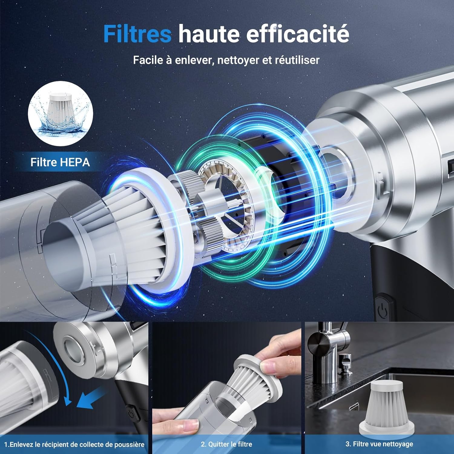 • 【Einfach zu Reinigen, Einfach ZU Warten】Der Mini staubsauger ist so konzipiert, dass er einfach zu reinigen und zu warten ist. Der Ministaubsauger wird mit zwei verschiedenen Filtern geliefert: einem Edelstahlfilter und einem Hepa-Filter. Die Filter