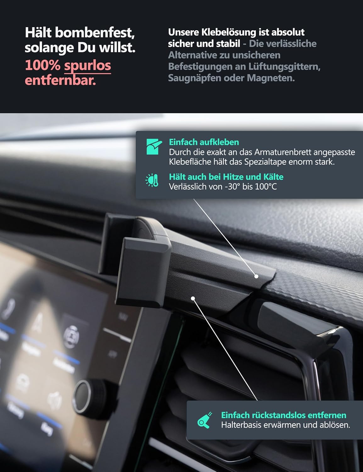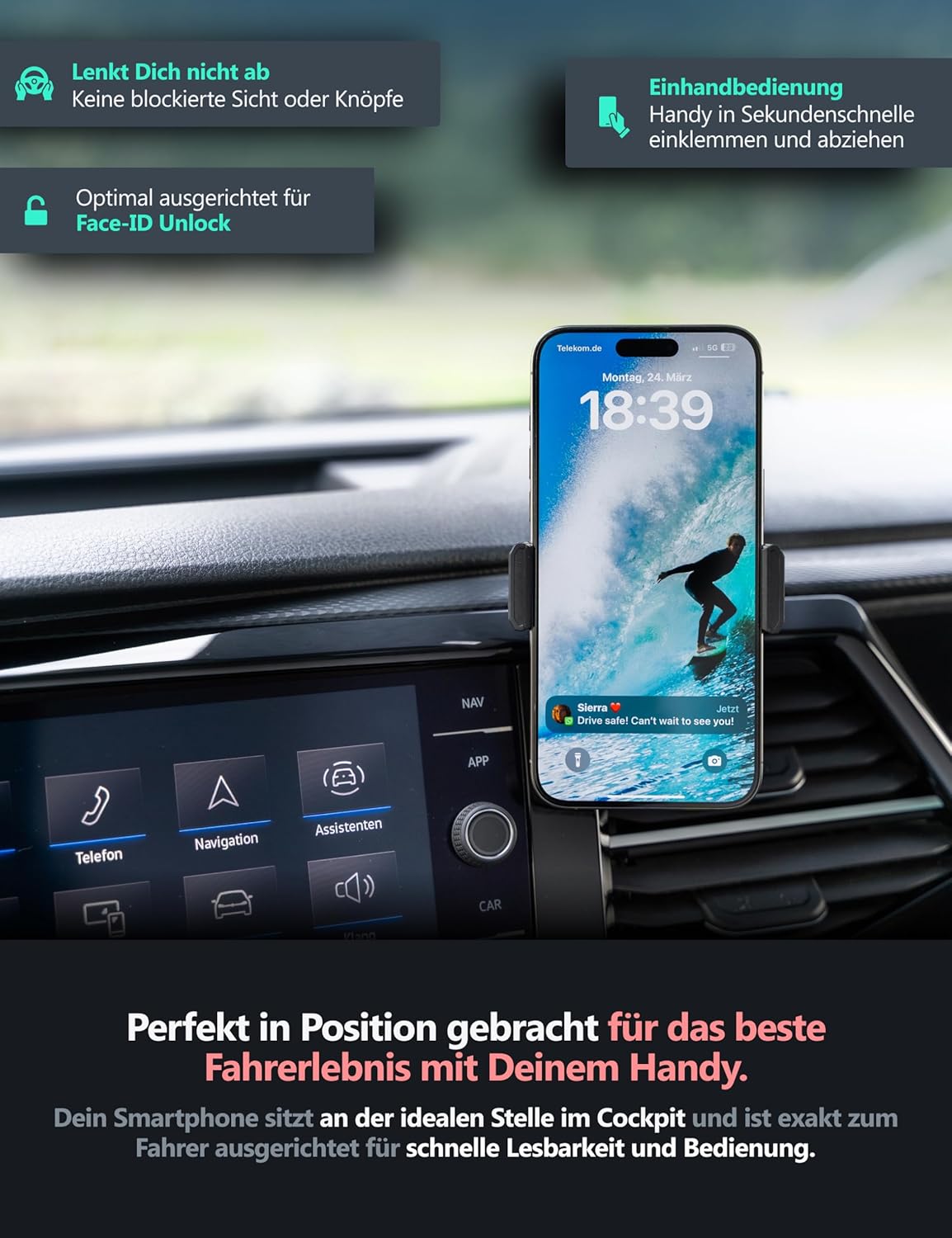 - PERFEKT IN POSITION GEBRACHT - Dein Smartphone sitzt elegant und komfortabel an der idealen Stelle im Cockpit, exakt zu Dir ausgerichtet für schnelle Lesbarkeit, einfache Bedienung und Face-ID Unlock