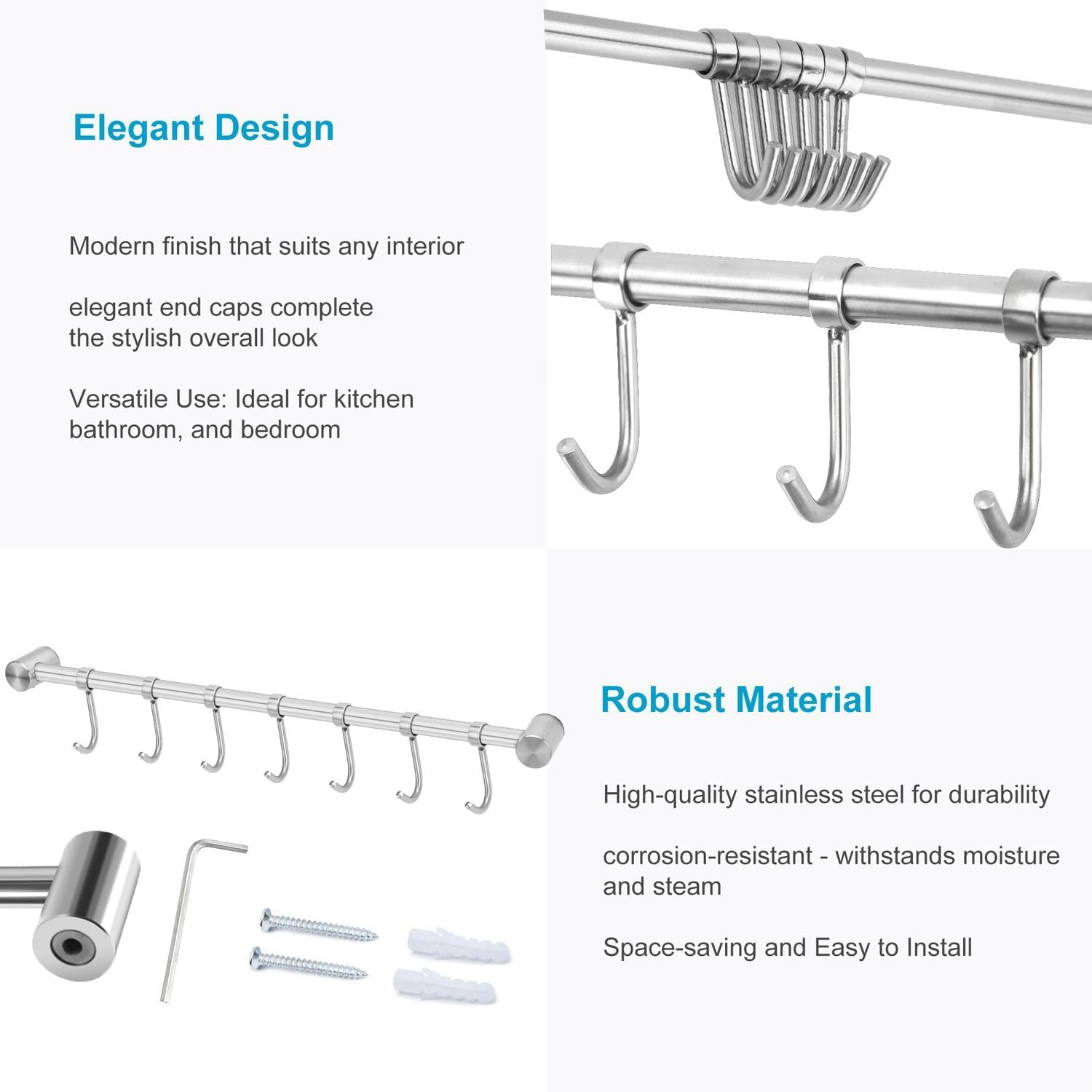 - Einfache und schnelle Montage der Küchenreling. Die Lieferung enthält eine Edelstahl Haltestange mit beweglichen Haken, 2 Schrauben, 2 Kunststoffdübel, 1 Inbusschlüssel. Zusätzlich wird kein Werkzeug benötigt.
