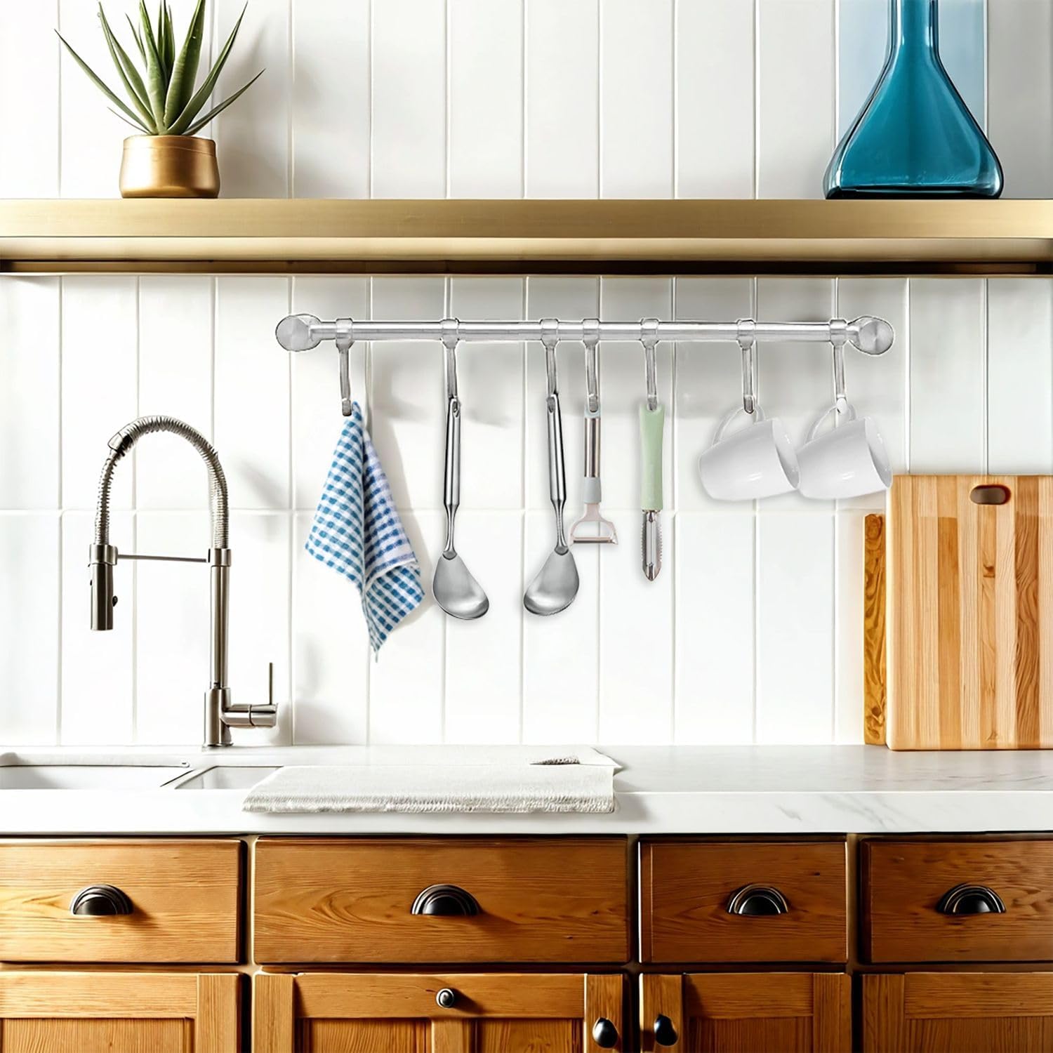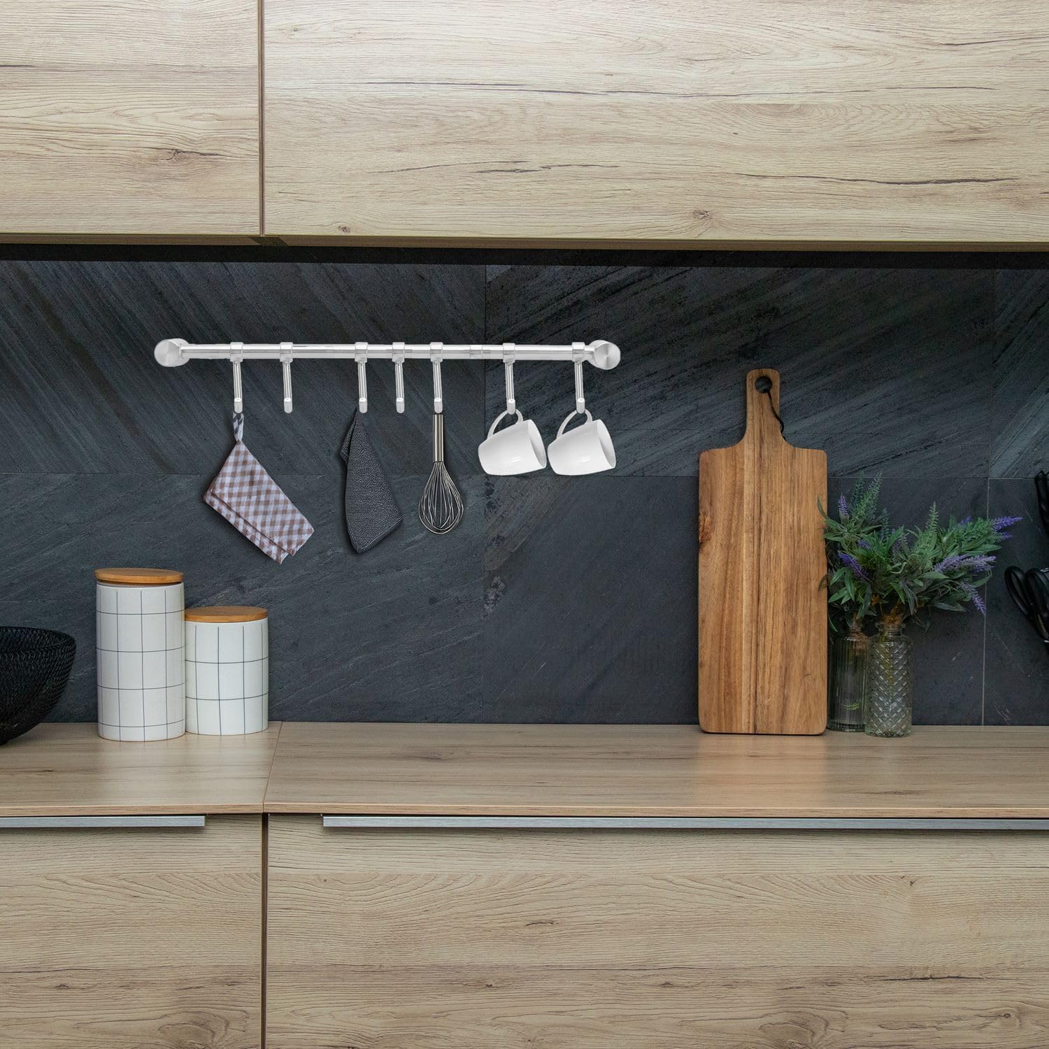 - Die moderne Küchenhängeleiste ist der perfekte Organizer für Küchenutensilien wie hängende Küchenwerkzeuge, Wender, Löffel, Tassen, Geschirrtücher oder Handtücher. Ein wahres Platzsparwunder für jeden Ordnungsliebhaber.