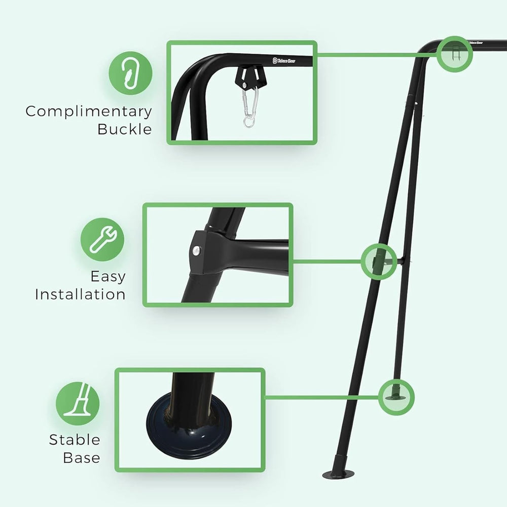 - Wetterfest: Der Hängemattenstuhl-Ständer ist für den Innen- und Aussenbereich konzipiert und aus wetterbeständigem, pulverbeschichtetem Stahl, um Rost zu verhindern und eine dauerhafte Unterstützung zu gewährleisten.