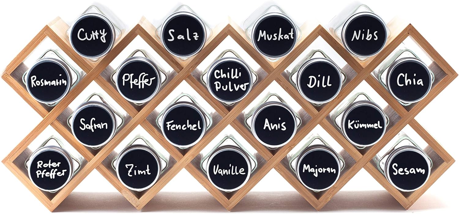 - ✅ PRAKTISCHE AUFBEWAHRUNG MIT 18 GEWÜRZGLÄSERN – Mit dem Gewürzregal von Hanseküche stehen Ihre wichtigsten Gewürze immer griffbereit. Neben dem Gewürzständer erhalten Sie 18 Gewürzgläser (jedes Glas hat 120 ml Fassungsvermögen) mit einer kleinen und grossen Streuöffnung zur optimalen Dosierung, 25 Etiketten und einem Marker. Dadurch schaffen Sie Übersicht in Ihrer Küche und können Ihre unterschiedlichen Gewürze einfach und flexibel einordnen.