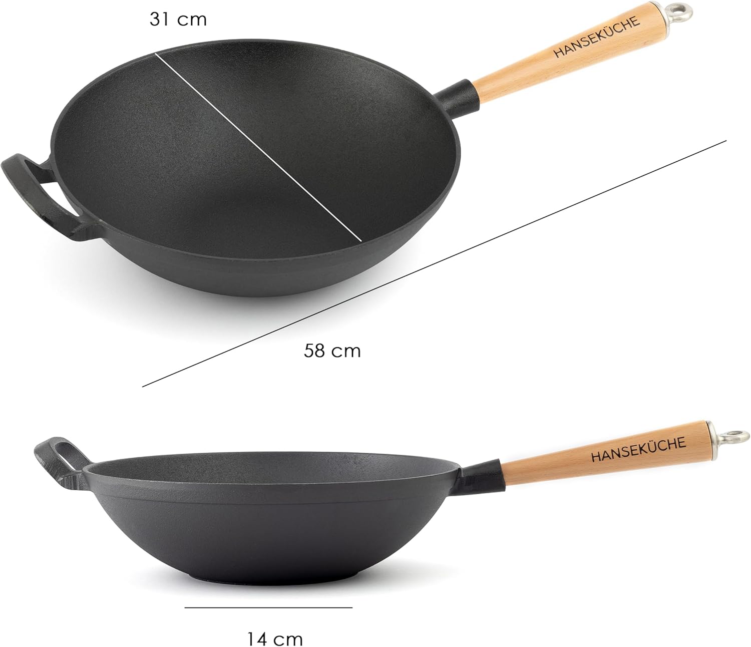 - ✅ OPTIMALE TEMPERATURBESTÄNDIGKEIT- Hergestellt aus emailliertem Gusseisen wird die Wärme optimal gespeichert und an das Gericht im Wok weitergegeben. Der Hanseküche Wok ist temperaturbeständig bis 400 Grad.