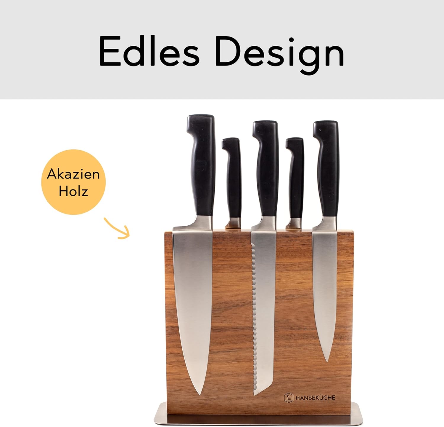 - ✅ HOCHWERTIG UND LANGLEBIG – Der Hanseküche Messerhalter ist aus hochwertigen Materialien gefertigt. Insbesondere die Verbindung von edlem Akazienholz und dem Standfuss aus Edelstahl sorgen für eine besondere Kombination in Ihrer Küche. Dank des integrierten Magneten können Sie Ihre Küchenmesser einfach und griffbereit aufbewahren.