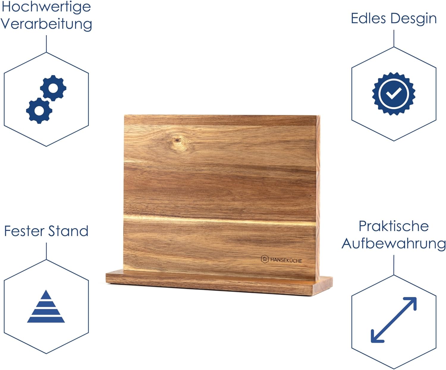 - ✅ HOCHWERTIG UND LANGLEBIG – Der Hanseküche Messerhalter ist aus hochwertigen Materialien gefertigt. Insbesondere der aufrechte Block und der Standfuss aus edlem Akazienholz sorgen für eine besondere Kombination in Ihrer Küche. Dank des