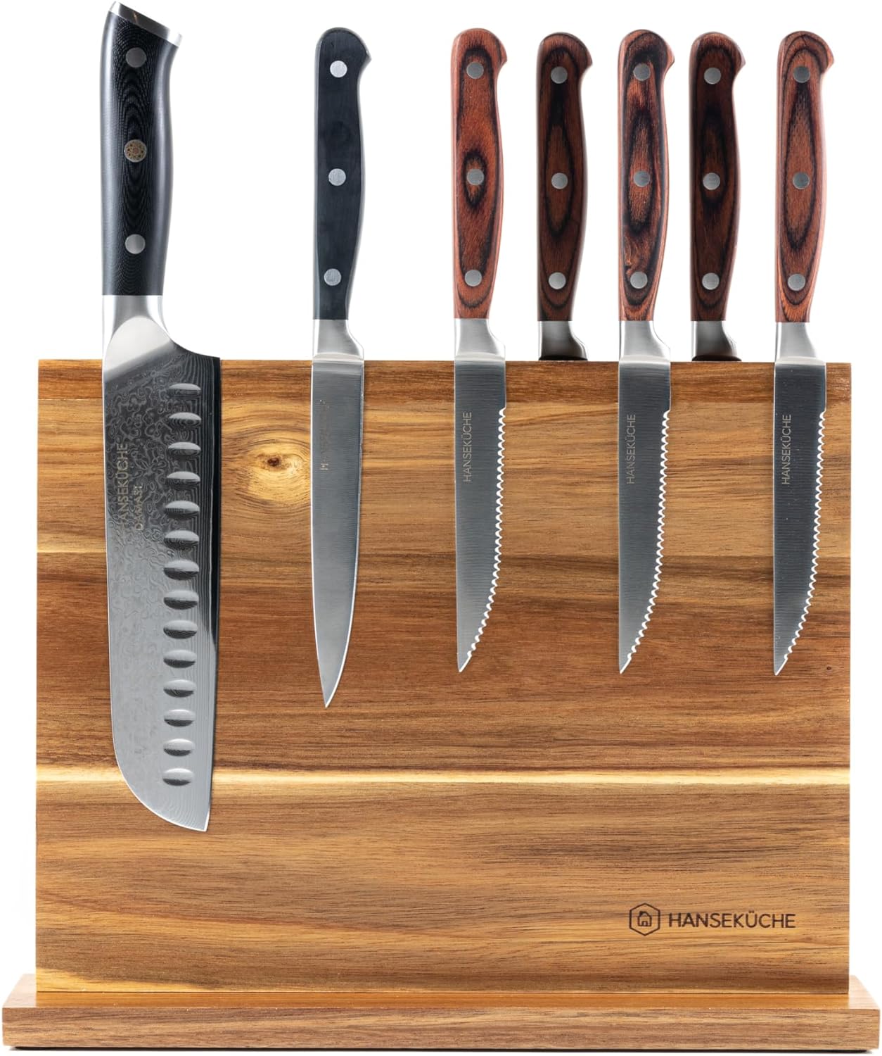 - ✅ PRAKTISCHE AUFBEWAHRUNG UND VIEL PLATZ – Mit dem Messerhalter von Hanseküche erhalten Sie eine praktische Aufbewahrungsmöglichkeit. Ihre Küchenmesser und Ihre Klingen werden durch die Aufbewahrung auf dem Akazienholz geschont und bleiben scharf.