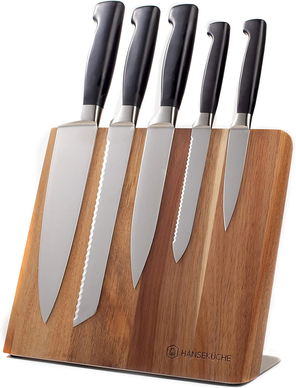 - ✅ SEHR HOCHWERTIG – Der Hanseküche Messerhalter ist aus hochwertigen Materialien gefertigt. Insbesondere die Verbindung von edlem Akazienholz und dem Standfuss aus Edelstahl sorgen für eine schöne Kombination in Ihrer Küche. Dank des integrierten und starken Magneten können Sie Ihre Küchenmesser griffbereit aufbewahren.