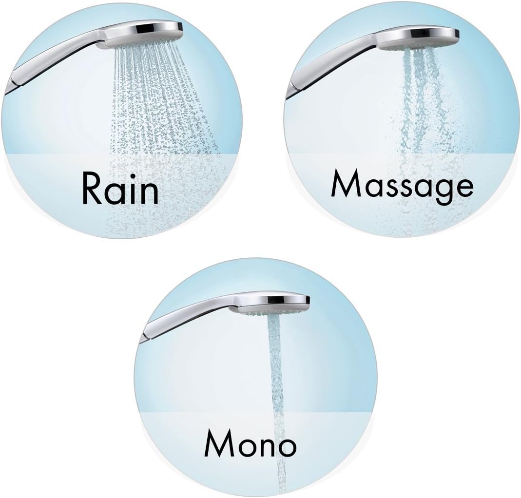 - Drei Strahlarten: angenehm prasselnder Regenstrahl (Rain), starker gebündelter Strahl (Mono), konzentrierter und pulsierender Wasserstrahl (Massagestrahl)