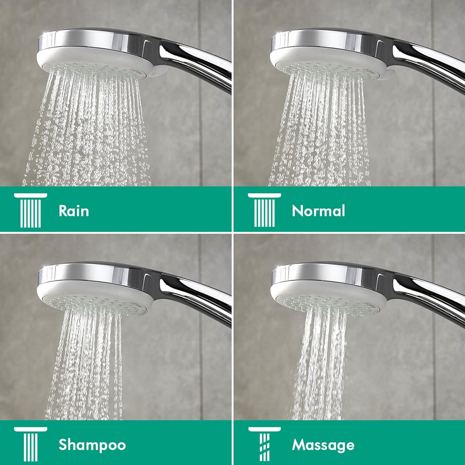 • Vier Strahlarten: angenehmer Regenstrahl (Rain), grossflächiger Brausestrahl (Normalstrahl), kräftiger Strahl zum Haarewaschen (Shampoostrahl), konzentrierter und starker Wasserstrahl (Massagestrahl)