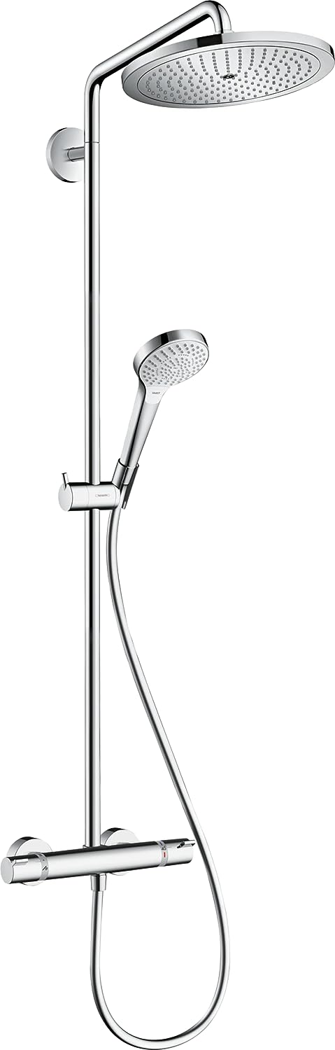 - Duschsystem bestehend aus: Kopfbrause (Ø 280mm), Brausestange, Thermostat, Brauseschieber, Handbrause (Ø 110mm), Brauseschlauch (1,60m), Befestigungsmaterial, Montageanleitung