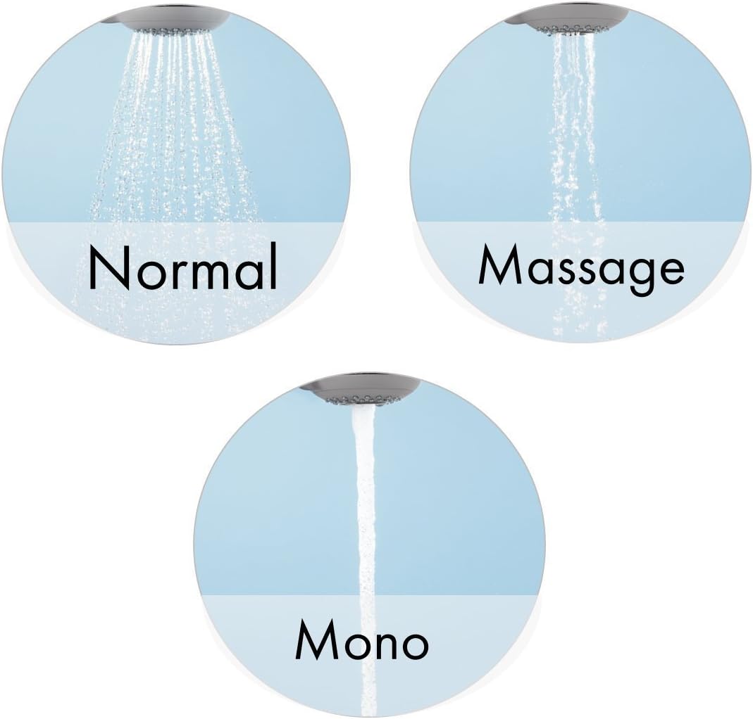 • Drei Strahlarten: angenehm prasselnder Regenstrahl (Normalstrahl), starker gebündelter Strahl (Mono), konzentrierter und pulsierender Wasserstrahl (Massagestrahl)