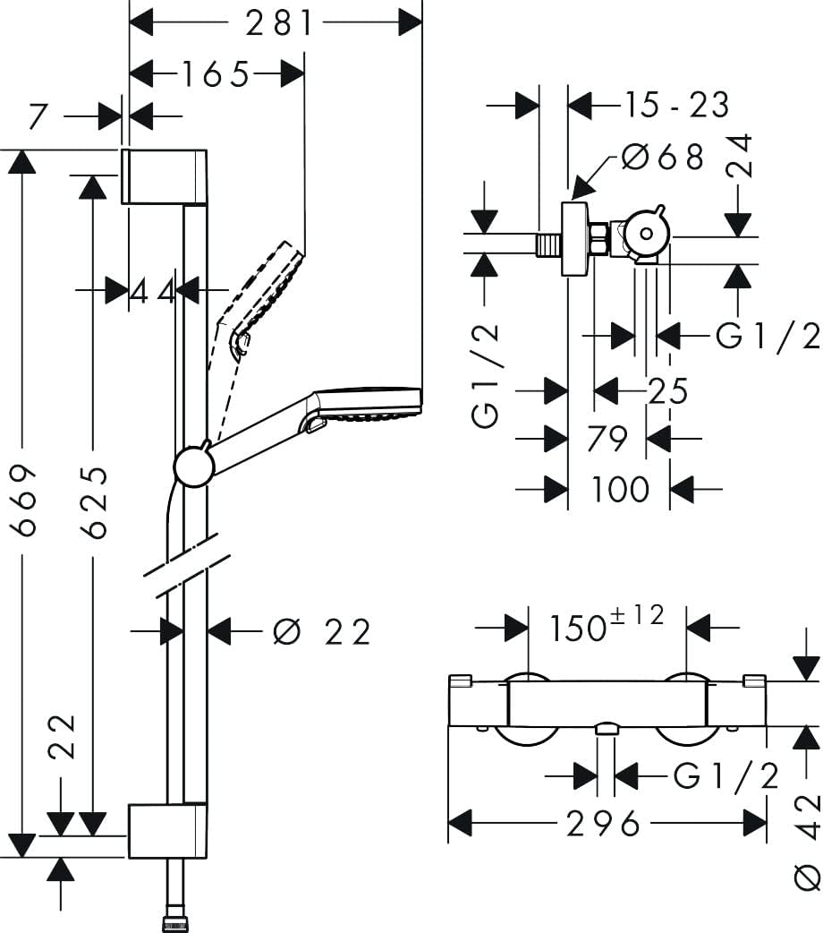 • Thermostatset bestehend aus: Handbrause (100mm), Brausenatange (0,90m), Brauseschieber, Brauseschlauch (1,60m)