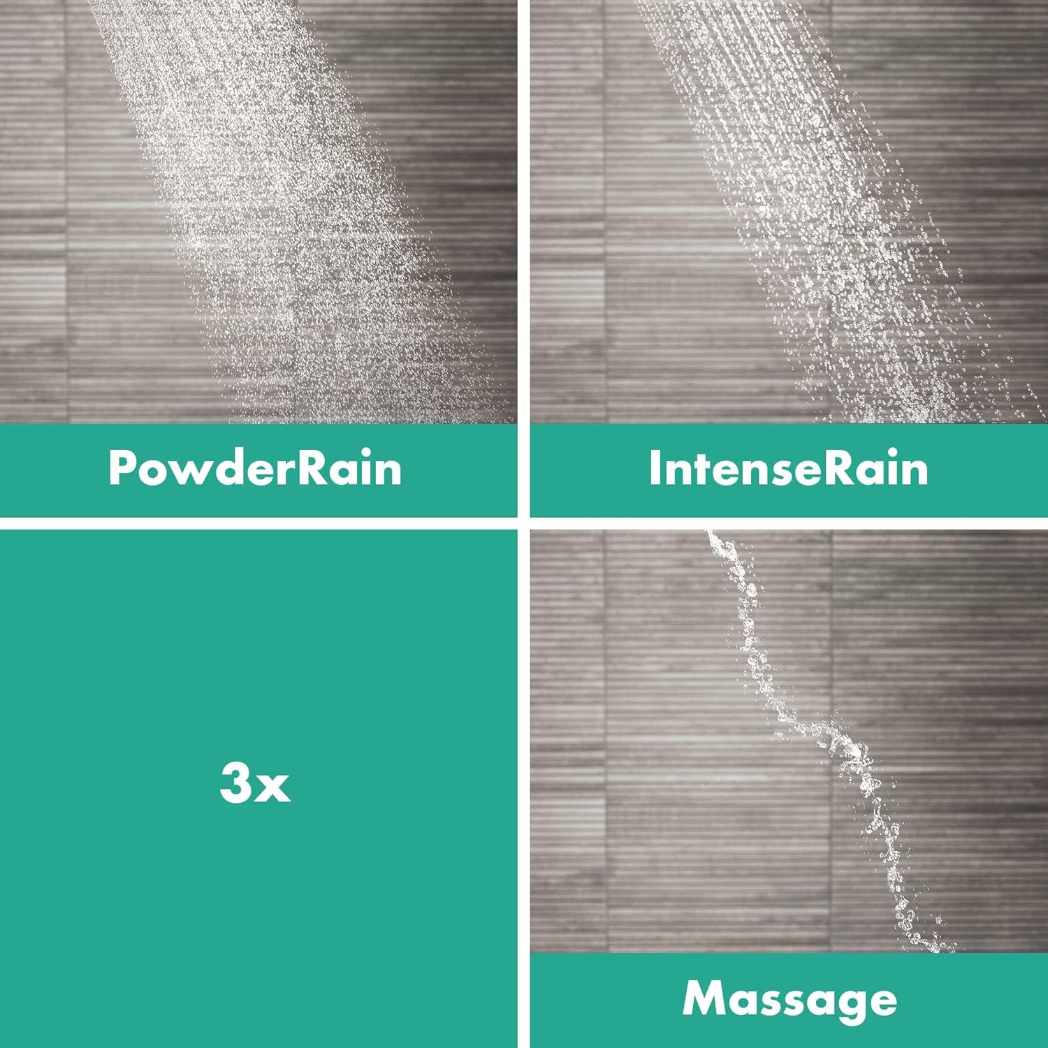 • Abwechslung durch drei Strahlarten: sanft einhüllender PowderRain, kräftiger Regenstrahl IntenseRain und entspannender Massagestrahl