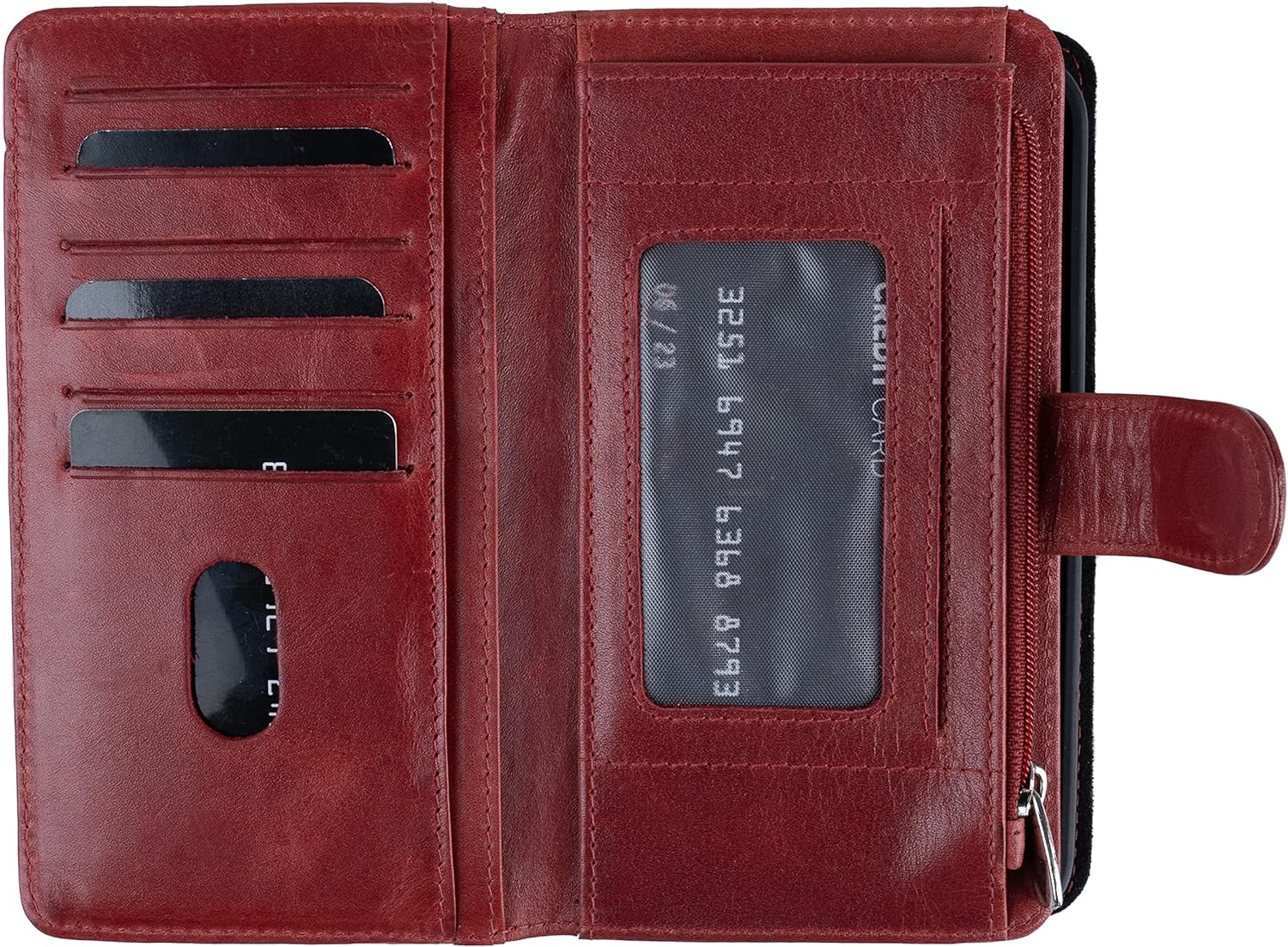 - LEICHTE BEDIENUNG: Die Handyhülle verfügt über 12 Kartenfächer, davon 2 mit Sichtfeld + 3 Steckfächer für Scheine oder Notizen + 1 Hartgeldfach mit Reissverschluss und Dehn Falte zur optimalen Öffnung des Kleingeldfaches. Durch die magnetisch