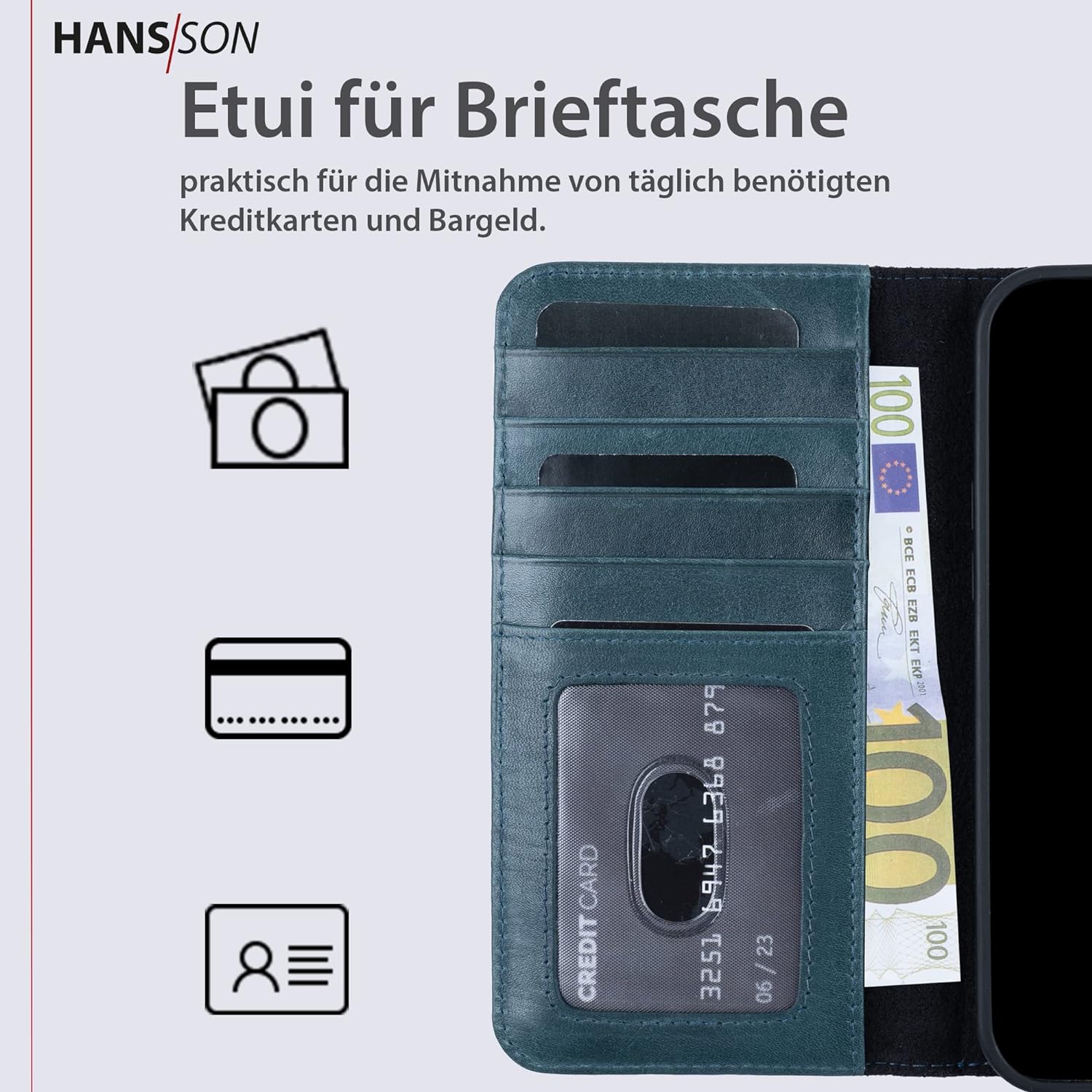 HANS/SON Hülle aus Echtleder mit Kartenfächern in Petrol | Blaue iPhone 13 Pro Max Klapphülle | Geld