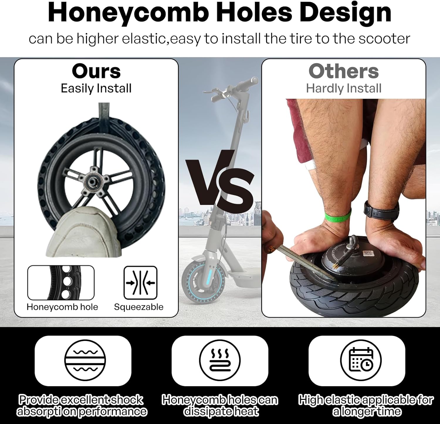 - 🛴Wabenlochdesign: Das spezielle Wabenlochdesign des Rollerreifens sorgt dafür, dass er mit hervorragenden Stossdämpfern, Explosionsschutz und Druckbeständigkeit ausgestattet ist Wabenlöcher lassen sich leichter einbauen.