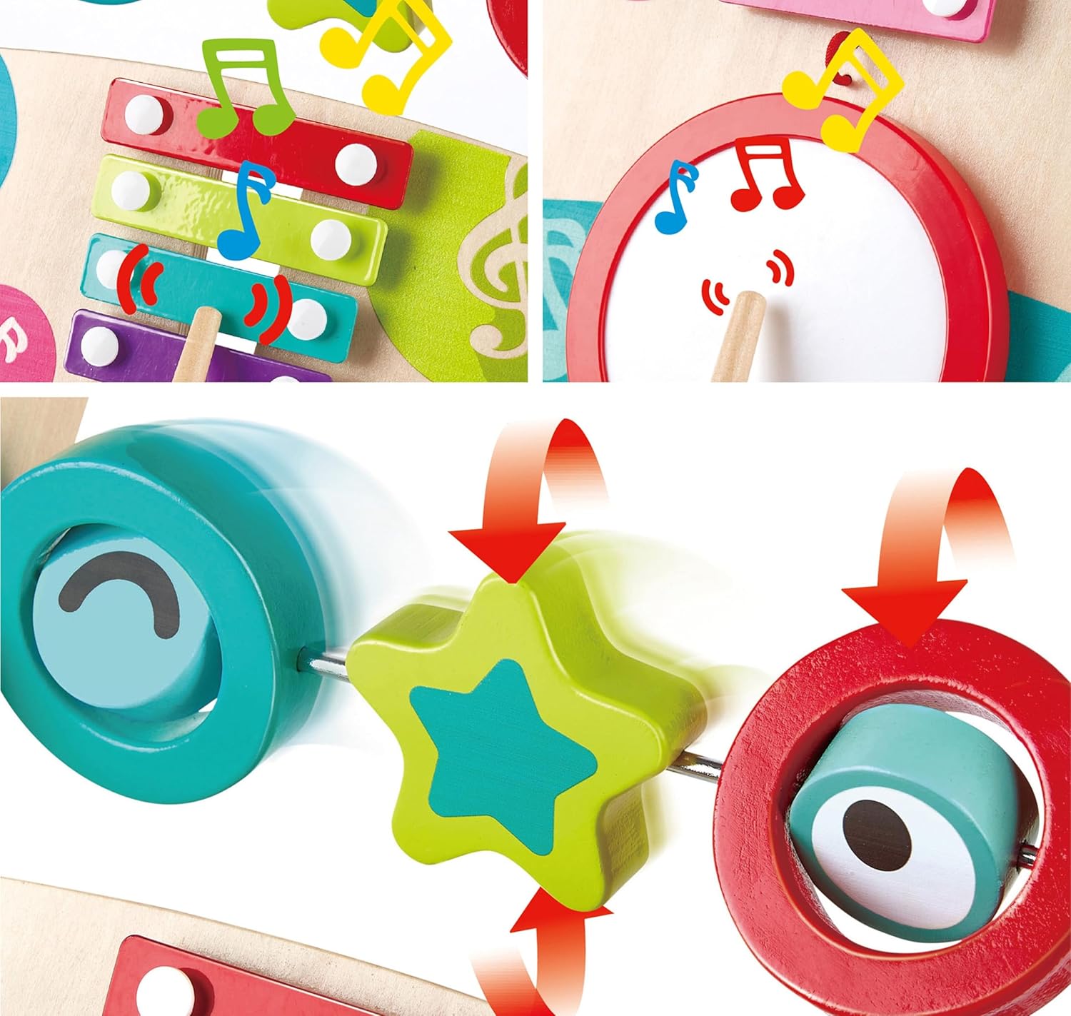 • Frühe Entwicklung der Kinder: Auch im Sitzen kann Ihr Kind gerne mit den Musikinstrumenten spielen. Steigern Sie Hand-Augen-Koordination und sensorische Entwicklung mit dem Schlagzeug, Xylophon und drehenden Blöcken