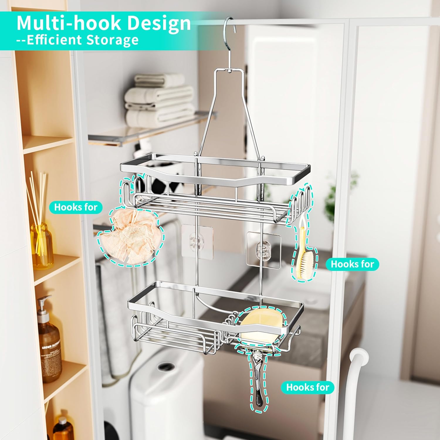 - [Multifunktionales Design Dusche Ablage Hängen ]: Duschablage ohne bohren hängend mit 360 ° Drehhaken kann an der Glastür und Duschstange des Badezimmers verwendet werden. Sie erhalten 2 Duschablage ohne bohren mit mehreren Haken und einen