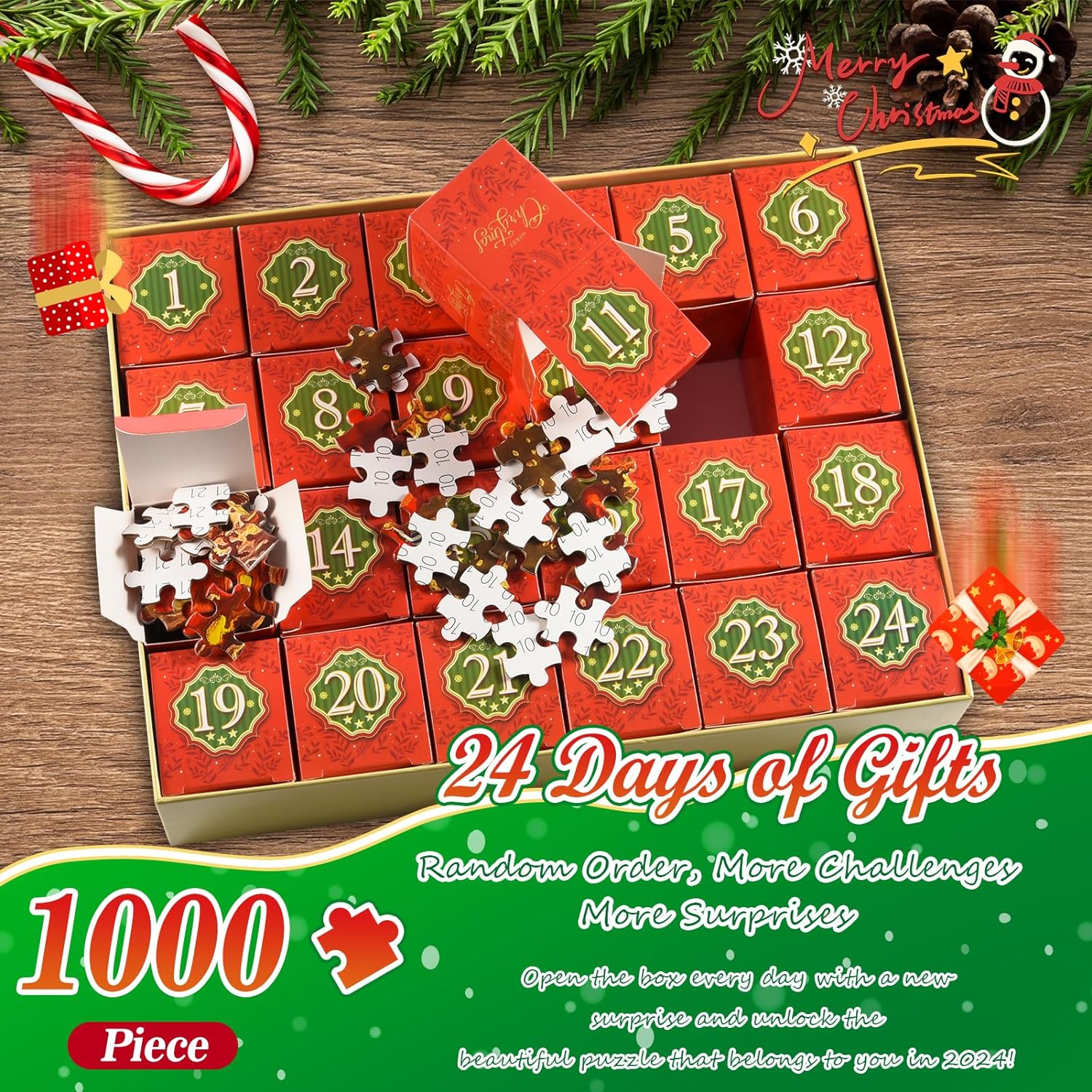 - đ§©ă2023 Adventskalender PuzzleăDieses Weihnachtspuzzle enthĂ€lt 24 nummerierte Schachteln mit insgesamt 1.000 Puzzleteilen und ein farbiges Referenzplakat 1: 1. Sie können die passende Schachtel zur Position des Puzzles finden, indem Sie den auf