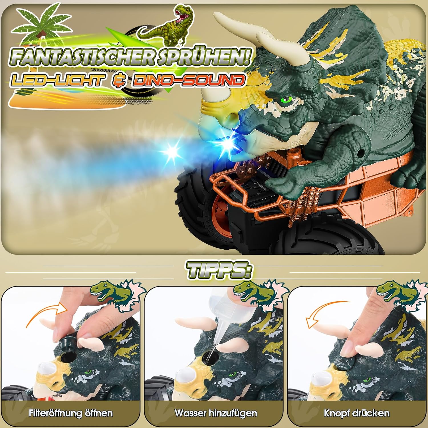 - 🌋LED-LEUCHTEN, DINOSAUR-SOUNDS & SPRAY -- Dieses RC-Dinosaurier-Autospielzeug fährt nicht nur vorwärts/rückwärts und wendet rechts/links wie ein echtes Auto, es hat auch coole Dinosaurier-LED-Blaulichter und brüllende Geräusche und sprüht wie