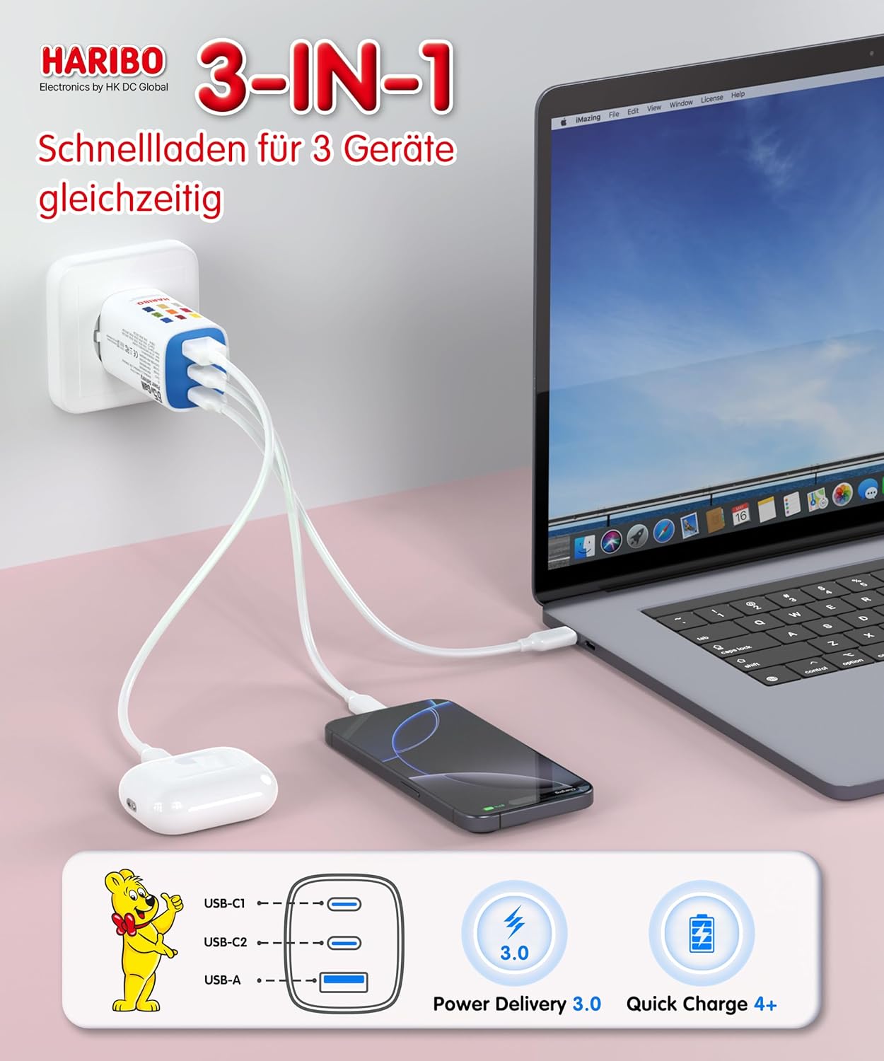 - 65W USB C Ladegerät: Das Haribo 65W GaN Schnellladegerät kombiniert niedliches Design mit starker Leistung. Mit drei Anschlüssen ausgestattet – USB-1 und USB-2 liefern jeweils bis zu 65W – eignet es sich perfekt für Laptops, Tablets und