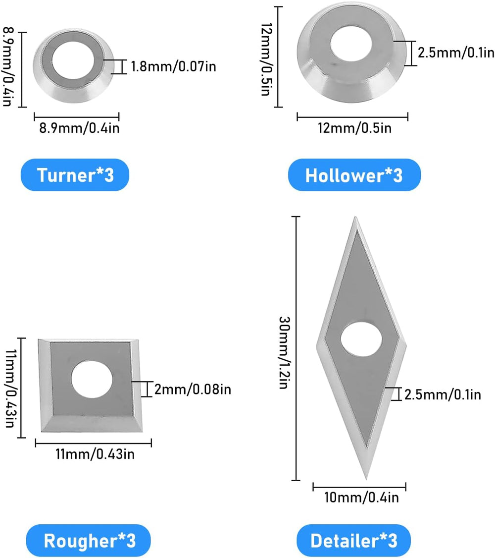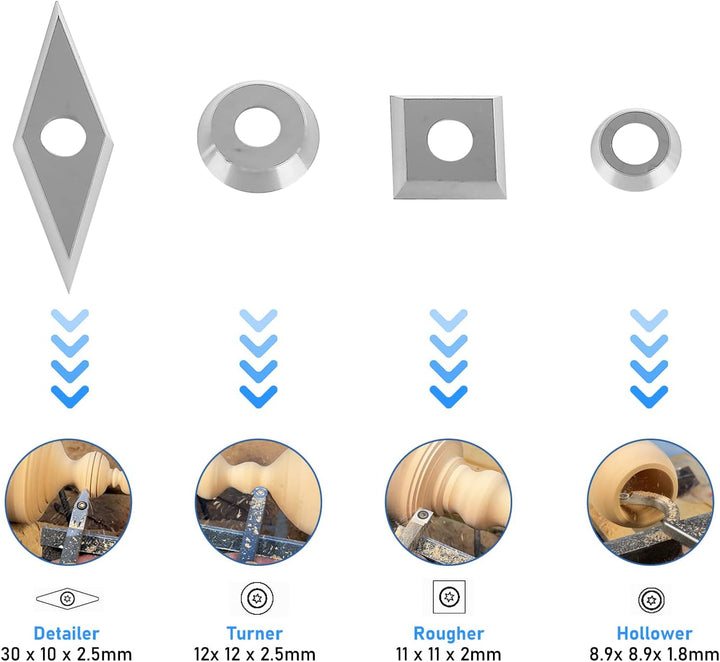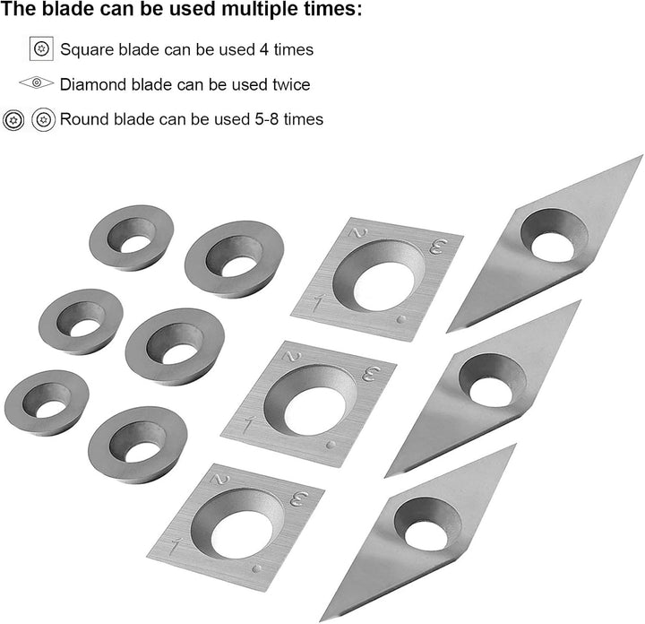 - 🍌【Hartmetall Einsatzschneider Set】Unser Hartmetall Schneidplatten Set enthält 2 x 11*11mm 30 Grad Vierkant Klinge, 2 x Φ12mm Rund Klinge, 2 x Φ8.9mm Rund Klinge, 2 x 30*10mm Diamant Klinge und 4 x M4 Schrauben. Es sind verschiedene