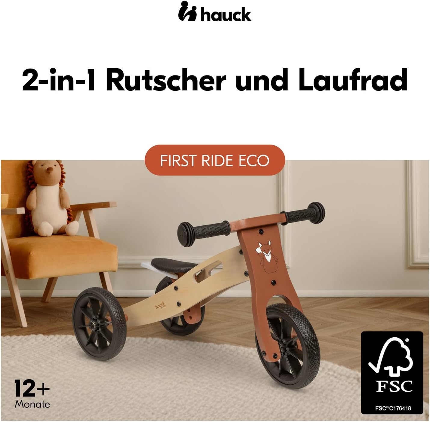 Hauck First Ride Eco, Fuchs - 2 in 1 Holz Dreirad Rutscher & Zweirad Laufrad mit 7,5 Zoll Räder für
