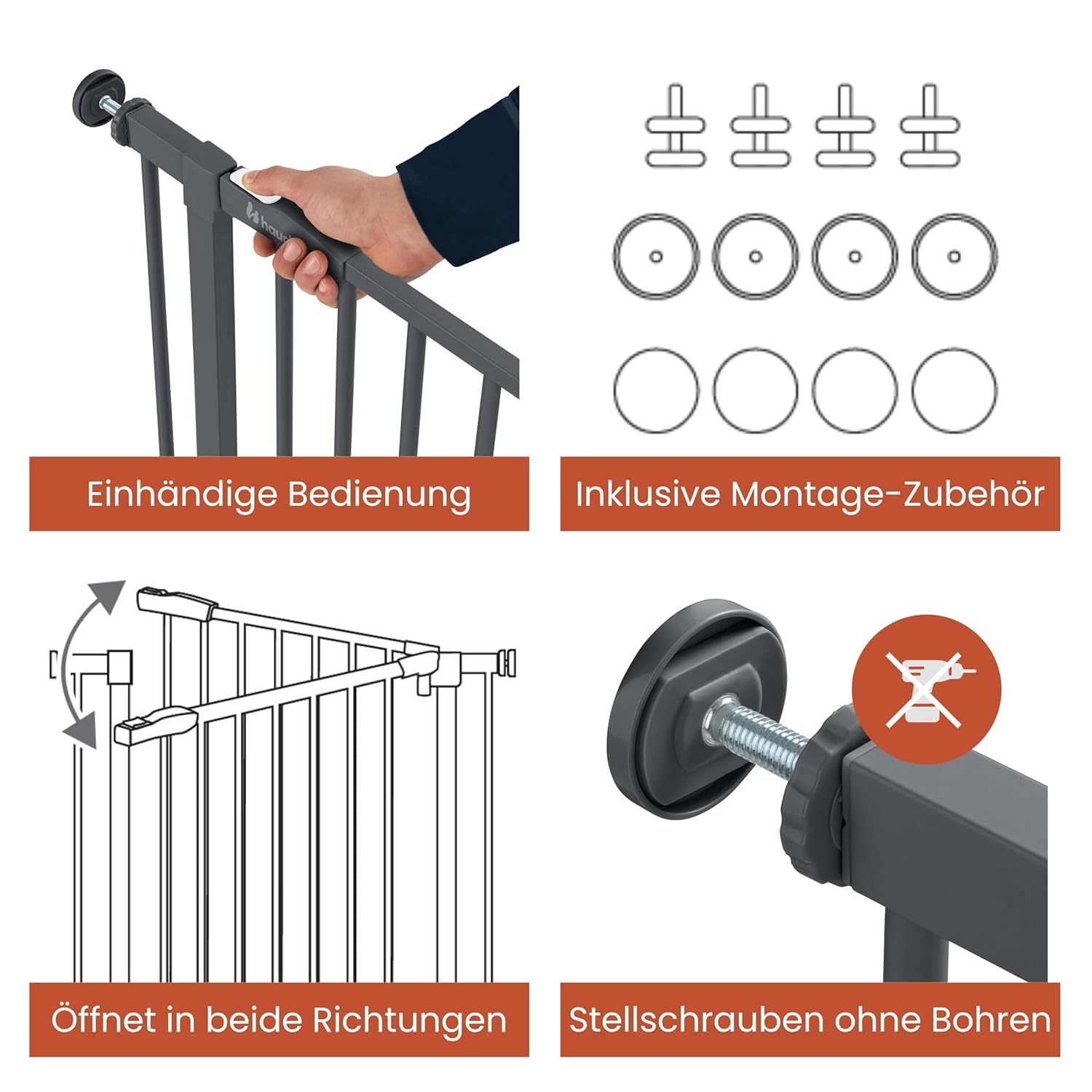 - Wichtig: Das Seitenteil ist beim Auspacken schief – das ist normal und kein Qualitätsmangel; durch das Anziehen der vier Stellschrauben wird das Babygitter automatisch geradegezogen