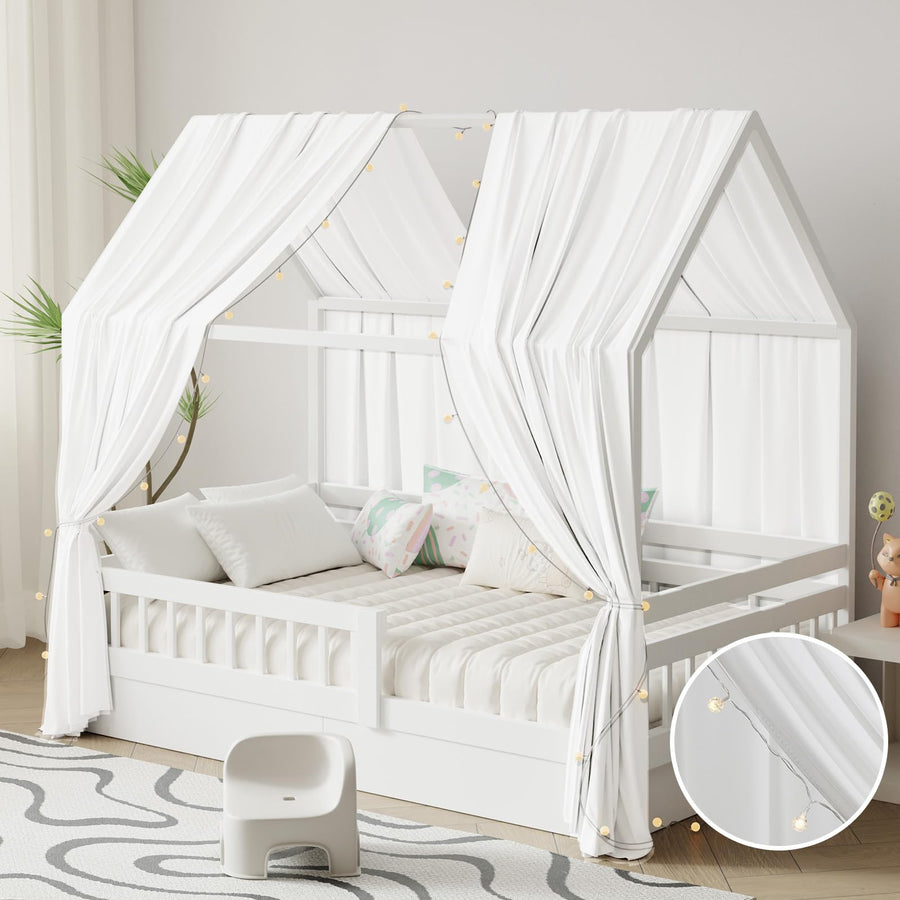 - Baldachin Hausbett Set: Enthält 2 Stück hausbett himmel(Masse: 135 x 350 cm) und eine 6 Meter lange Lichterkette.Batterien für die Lichter sind nicht im Lieferumfang enthalten und müssen separat erworben werden.Die betthimmel hausbett sind in vier
