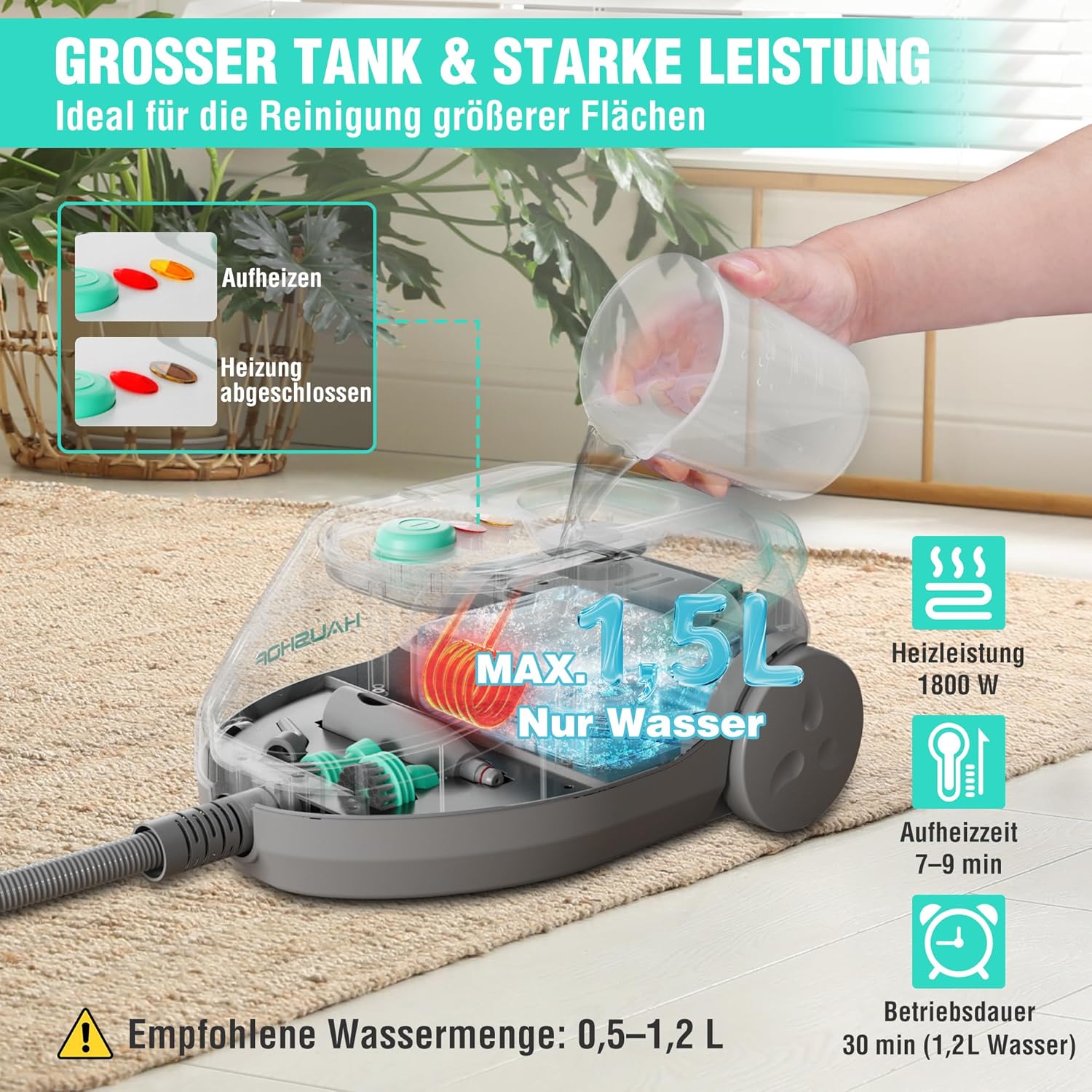 - Grosse Kapazität & starke Leistung: Mit 1800W heizt der Dampfreiniger in nur 7–9Minuten auf. Der 1,5L Tank liefert bis zu 30Minuten kontinuierlichen Dampf – ideal für ausgedehnte Reinigungsarbeiten im Haushalt