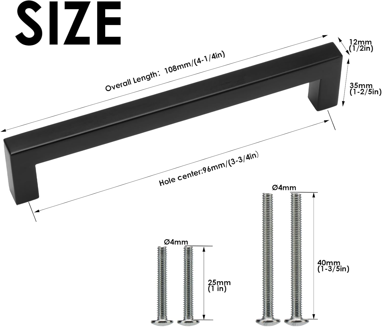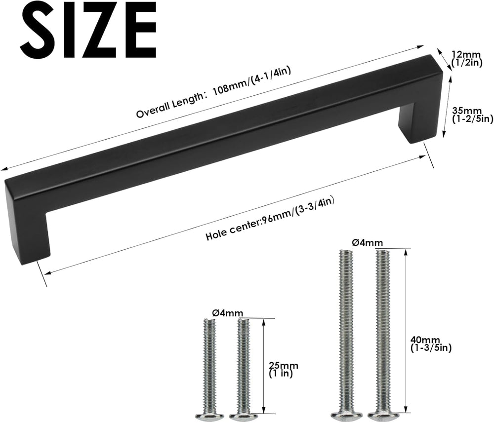 - Grösse der Griffe: Gesamtlänge: 108 mm, Bohrlochabstand: 96 mm, Breite 35 mm, Anzahl 15 Stück. Jeder Möbelgriff ist mit zwei Schrauben unterschiedlicher Länge ausgestattet, 2 Schrauben mit 25 mm Länge und 2 Schrauben mit 40 mm Länge.
