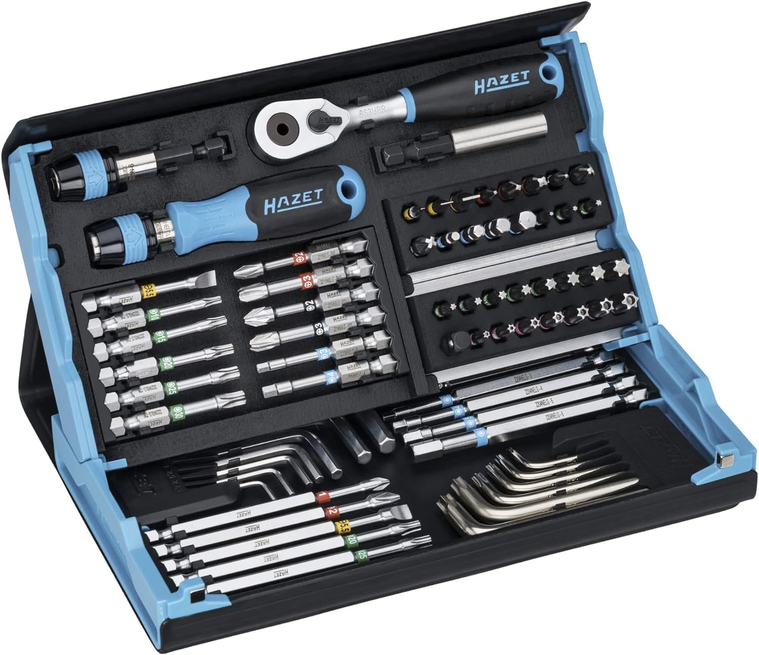 - LIEFERUMFANG: 1x HAZET 2200SC-31 Smart-Case Bit-Satz I 73 Teile, klappbarer Werkzeugsatz mit verschiedenen Abtrieben, kein herumfliegendes Werkzeug, Magnetverschluss I Abmessungen: 210 x 118 x 50 mm
