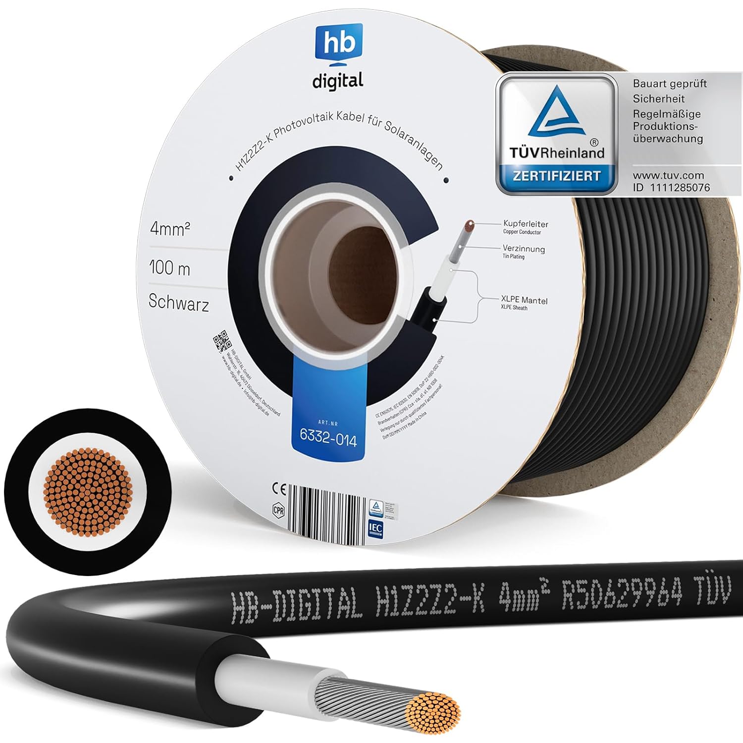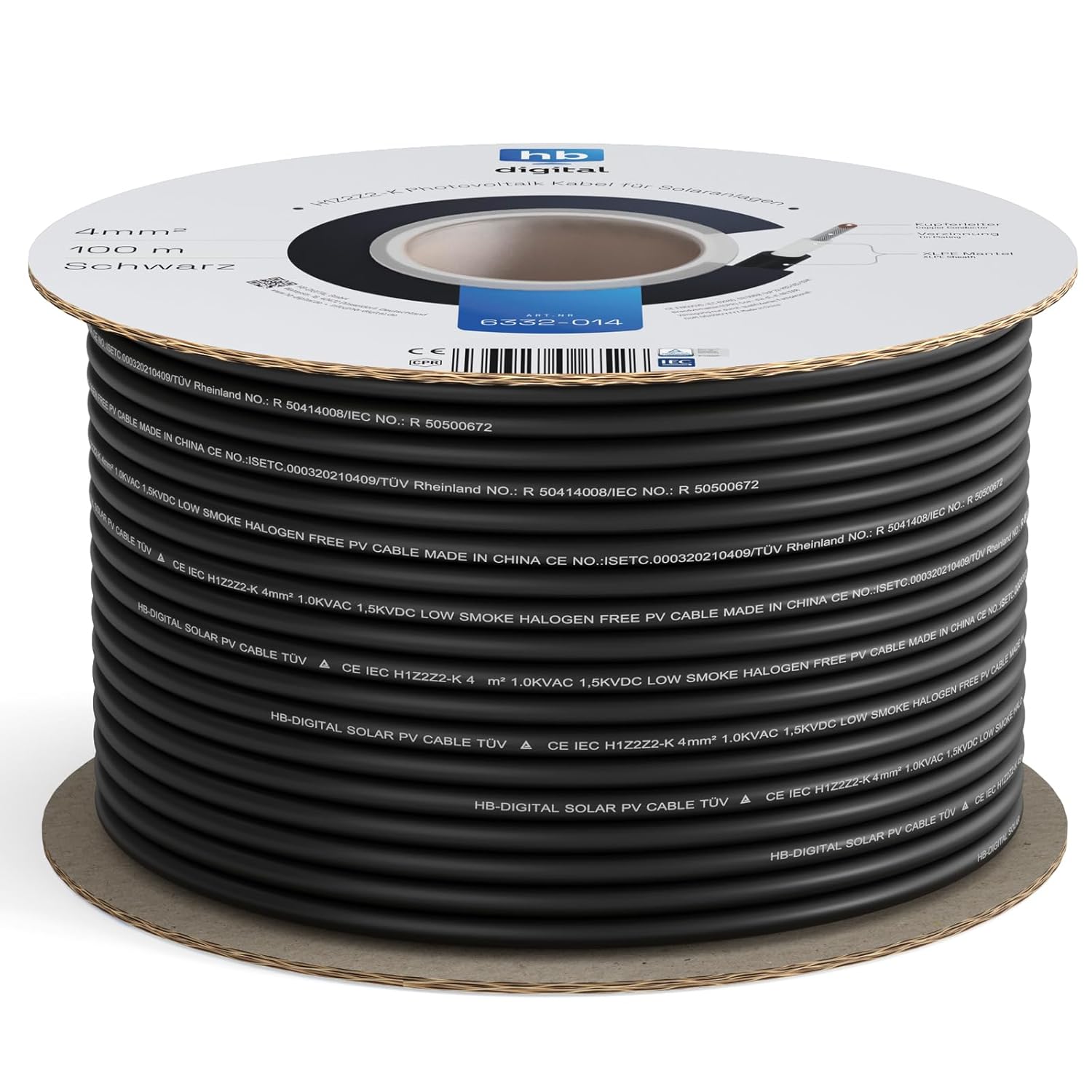 hb-digital 100m Solarkabel H1Z2Z2-K 4mm2 für Solarmodule Reines Kupfer Verlängerungskabel Solarpanel