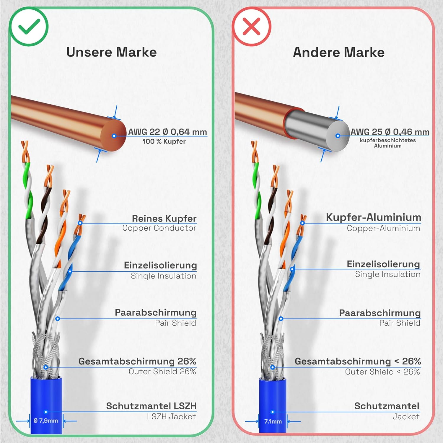 - HOCHWERTIGE QUALITÄT mit reinen Kupferadern (Cu) Ø 0,624mm, nach AWG 4x2x22/1, S/FTP doppelt geschirmt PiMF Geflechtgesamtschirm (Screened) + Folienpaarschirm (Foiled-Twisted-Pair) und halogenfreiem Mantel LSZH (Low Smoke Zero Halogen) Ø 7,9mm
