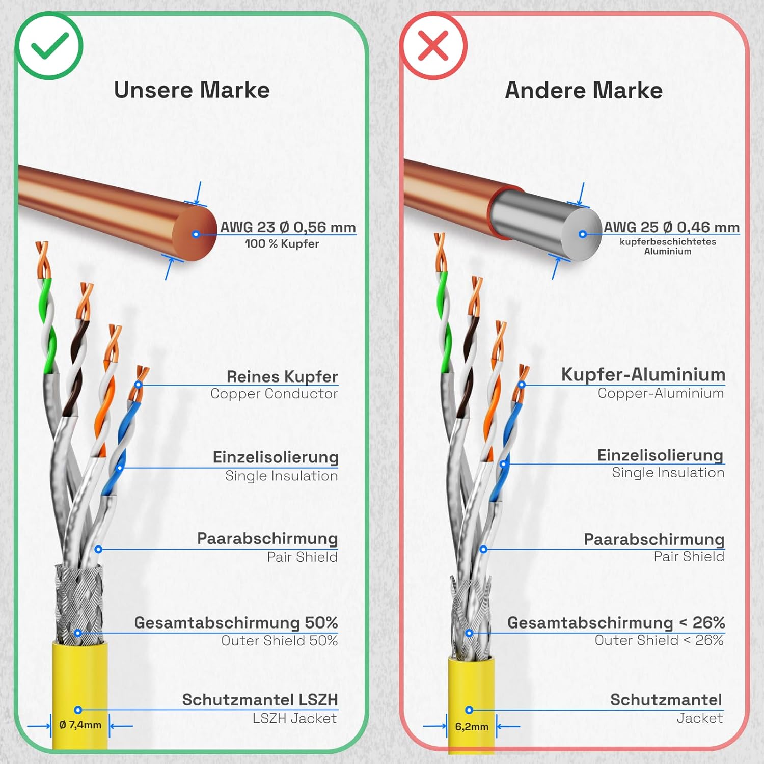 • HOCHWERTIGE QUALITÄT mit reinen Kupferadern (Cu) Ø 0,56mm, nach AWG 4x2x23/1, S/FTP doppelt geschirmt PiMF Geflechtgesamtschirm (Screened) + Folienpaarschirm (Foiled-Twisted-Pair) und halogenfreiem Mantel LSZH (Low Smoke Zero Halogen) Ø 7,2mm