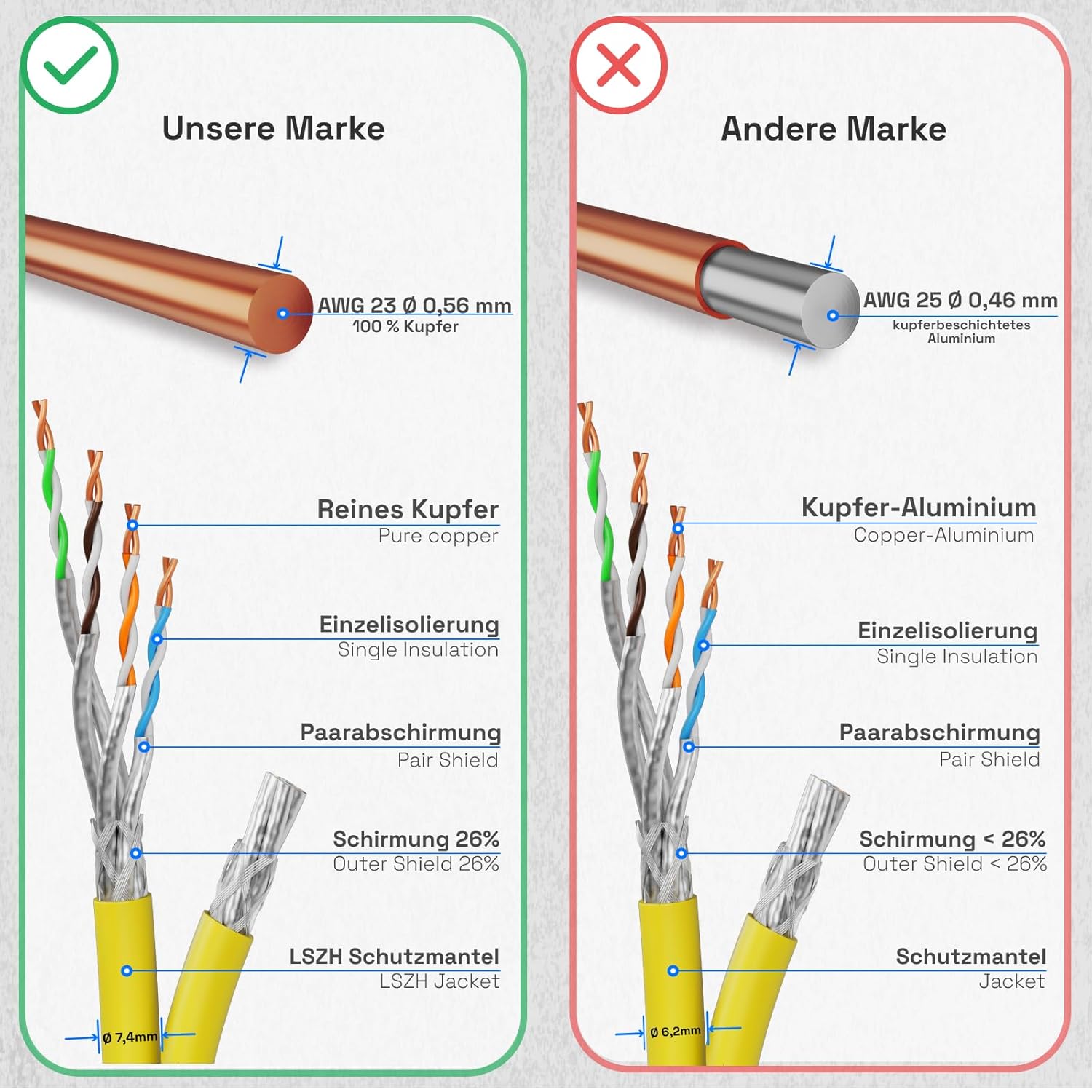• HOCHWERTIGE QUALITÄT mit reinen Kupferadern (Cu) Ø 0,56mm, nach AWG 4x2x23/1, S/FTP doppelt geschirmt PiMF Geflechtgesamtschirm (Screened) + Folienpaarschirm (Foiled-Twisted-Pair) und halogenfreiem Mantel LSZH (Low Smoke Zero Halogen) Ø 7mm