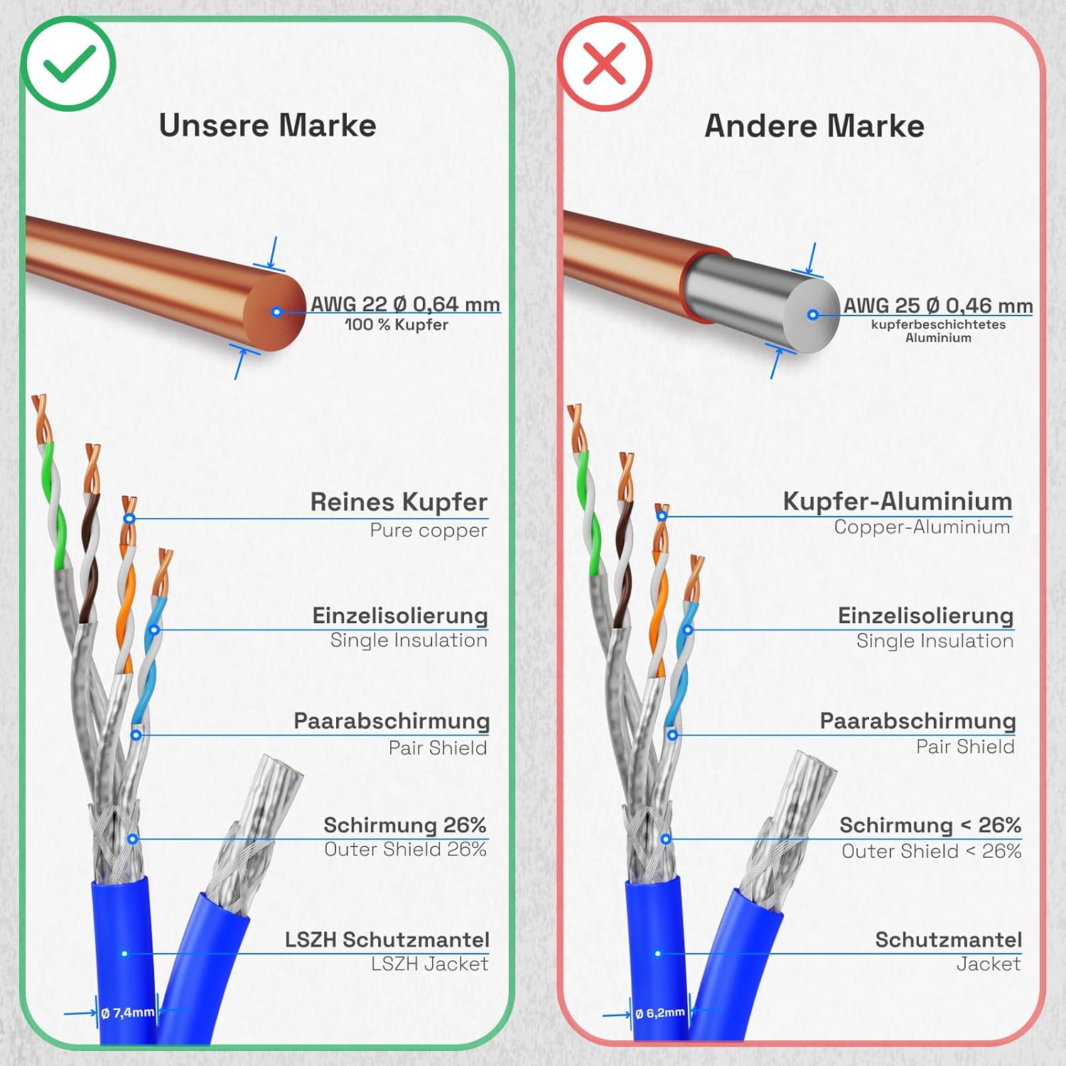 - HOCHWERTIGE QUALITÄT mit reinen Kupferadern (Cu) Ø 0,624mm, nach AWG 4x2x22/1, S/FTP doppelt geschirmt PiMF Geflechtgesamtschirm (Screened) + Folienpaarschirm (Foiled-Twisted-Pair) und halogenfreiem Mantel LSZH (Low Smoke Zero Halogen) Ø 7,9mm