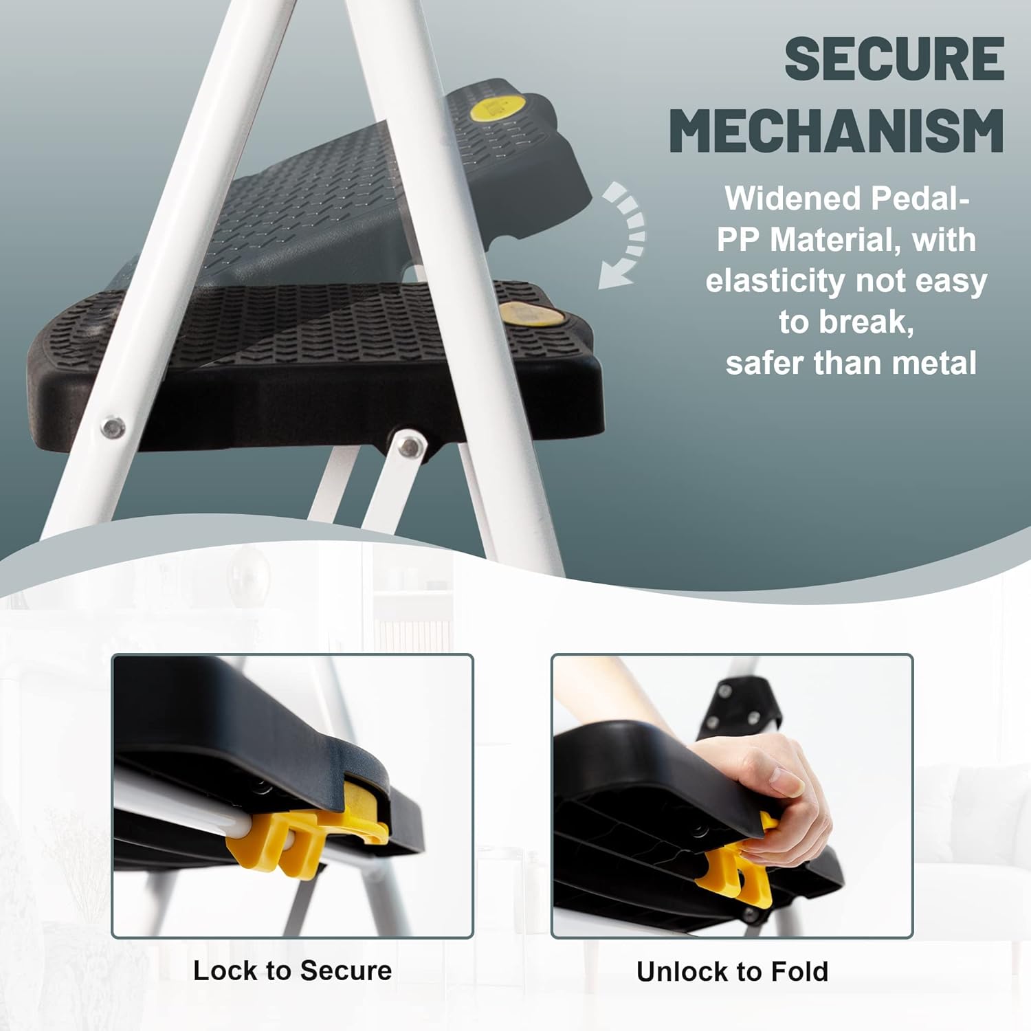 • Einzigartiges Sicherheits- und Anti-Rutsch-Design: Wenn Sie die Trittleiter verwenden, verriegelt sich die Sicherheitsmetallschnalle automatisch, sodass Sie sie sicher und bequem verwenden können. Bequeme Anti-Rutsch-Griffe und Ultrabreite